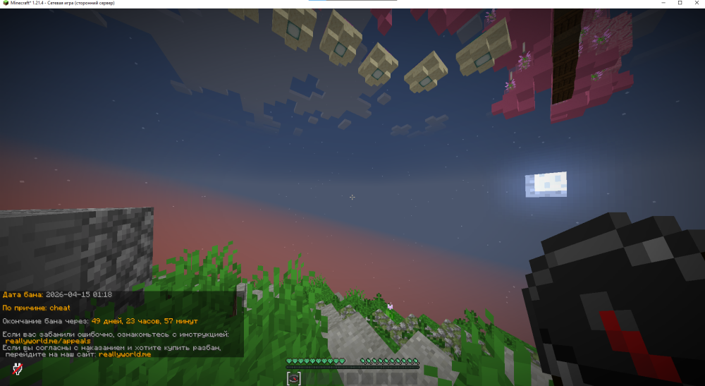 3. Ваш ник: imsohungry Дата нарушения: 2026-04-15 01:18 Суть нарушения: Cheat Номер грифа и режим гриферского выживания: 29 Доказательства о нарушении (фото/видео): Дополнительный комментарий: пошел на /pvp там был тип мы с ним пехались в итоге я решил улететь от него свапаю элитру использую фейрверк и мне дают бан по причине cheat надеюсь смогу обжаловать бан