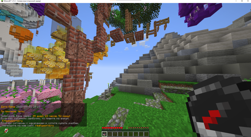 5. Ваш ник: MeowToper Дата нарушения: 2026-03-27 22:23 Суть нарушения: Cheat Номер грифа и режим гриферского выживания: 1 Доказательства о нарушении (фото/видео): Дополнительный комментарий: пошел на /pvp там был тип мы с ним пехались в итоге я решил улететь от него свапаю элитру использую фейрверк и мне дают бан по причине cheat надеюсь смогу обжаловать баг