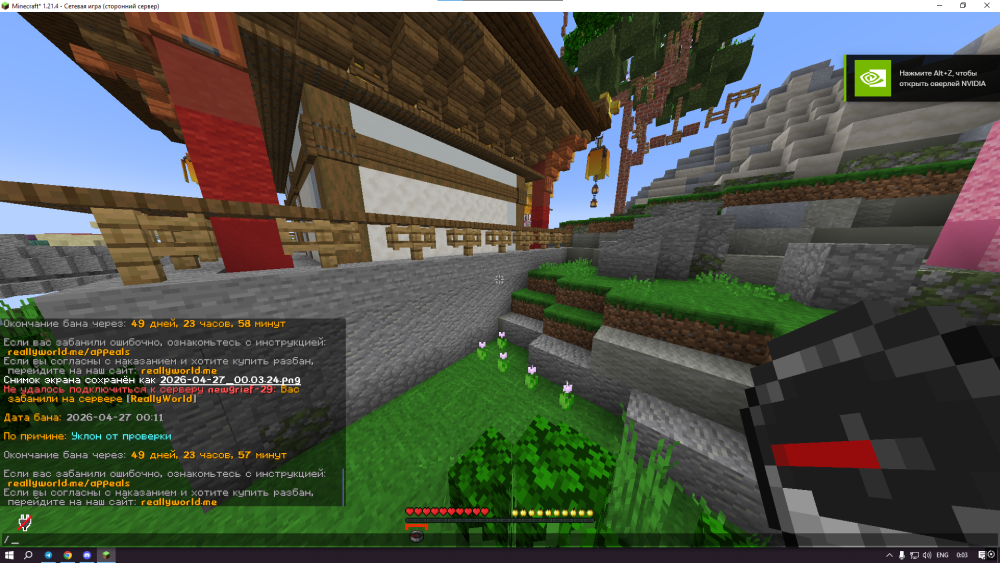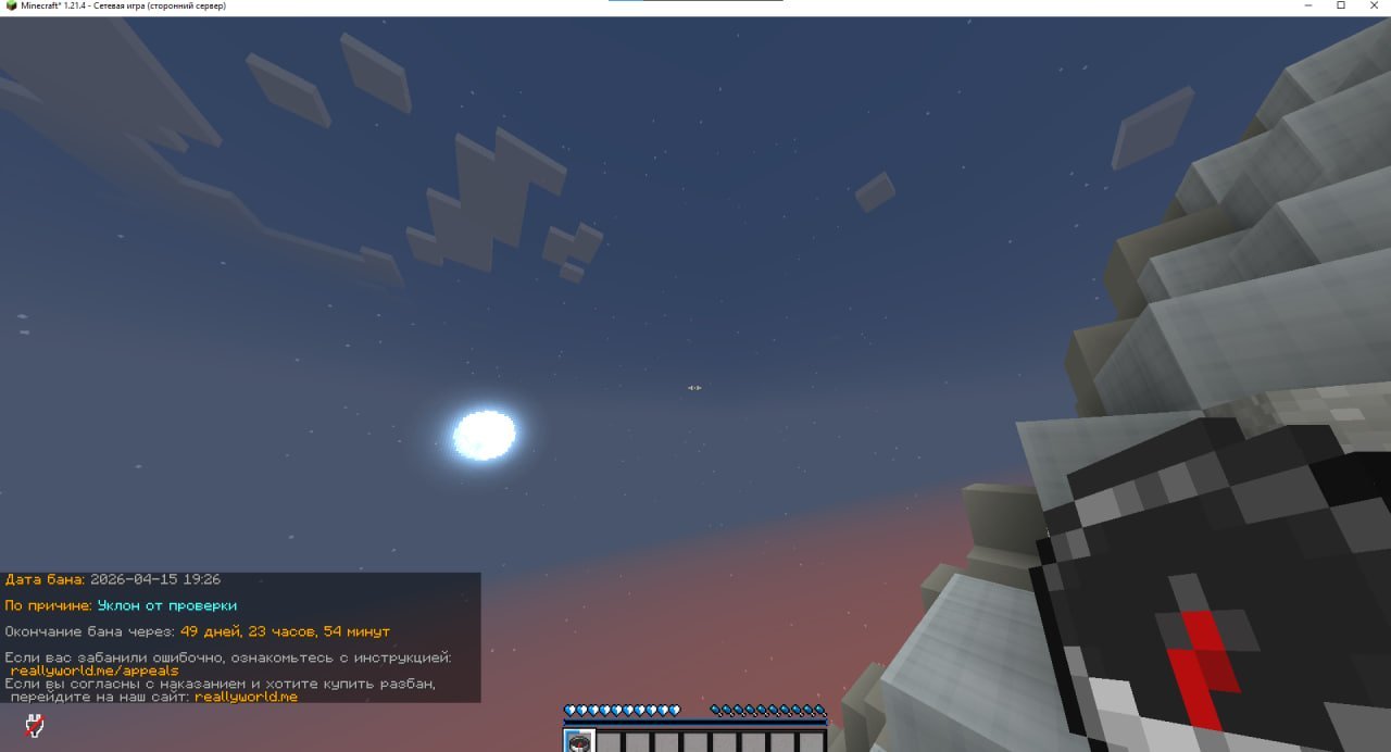 1. Ваш ник: IphoneFree2026 Дата нарушения: 2026-04-27 00:11 Суть нарушения: Уклон от проверки Номер грифа и режим гриферского выживания: 29 Доказательства о нарушении (фото/видео): Дополнительный комментарий: Вызвали на проверку читов кидаю модератору свой анидеск я ждал от него заявки на анидеск но он имня игнорировал я пытался и через /mod и просто писал но он игнорировал надеюсь смогу обжаловать бан