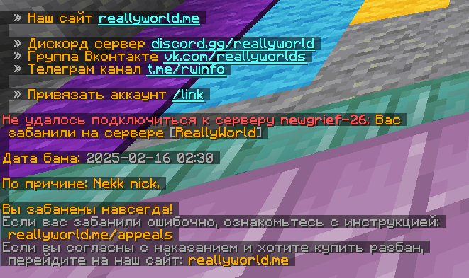 3. Ваш ник:Asie1488 Дата нарушения:2025.02.16 Суть нарушения:nekk nick Номер грифа и режим гриферского выживания:26 Доказательства о нарушении (фото/видео): Дополнительный комментарий:Акаунту буквально год бана я туда донатил оверлорд прошу разбаньте