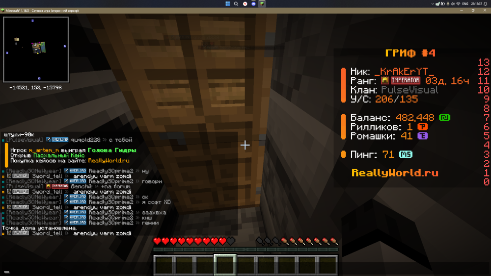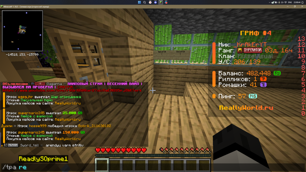 3. Ваш ник: _KrAkErYT_ Ник нарушителя: ReadlySQprime1 Дата нарушения: 20.04.2026 Суть нарушения: признал в читах забанили сейчас и создал новый забаньте пожалуйста На каком гриферском режиме было нарушение (MEGA-GRIEF/GRIEF-1.16) : 4 гриф Доказательства о нарушении (фото/видео): Дополнительный комментарий: сам спиной нас бил с килкой создал новый акк и пожалуйста забаньте по айпи