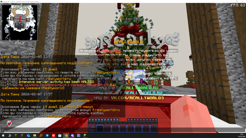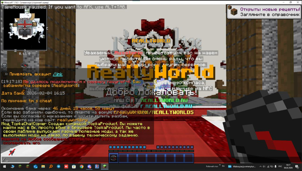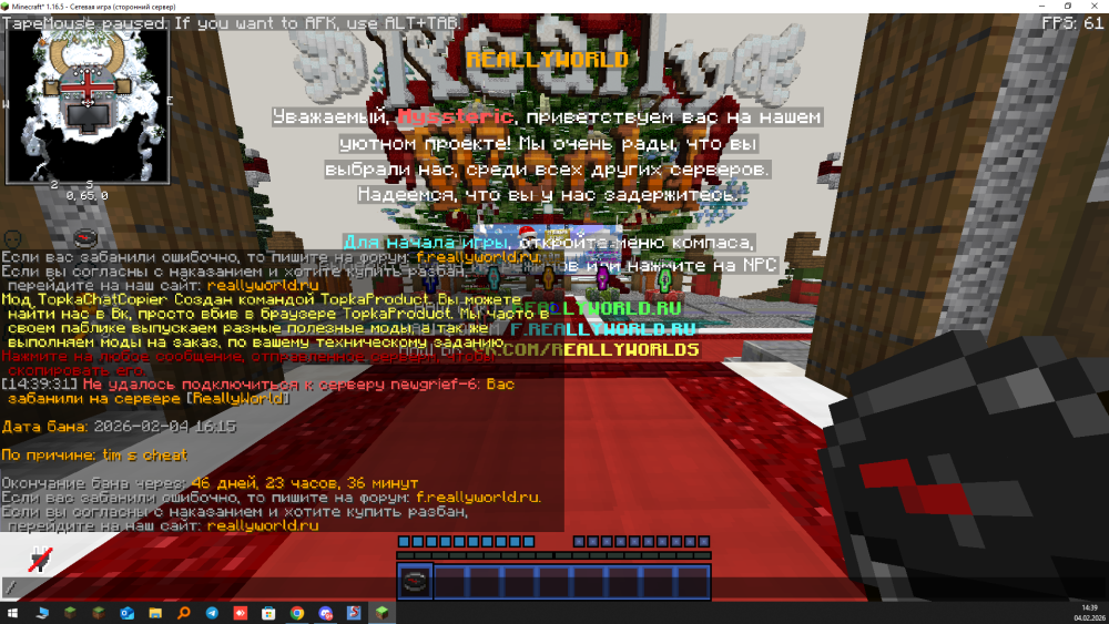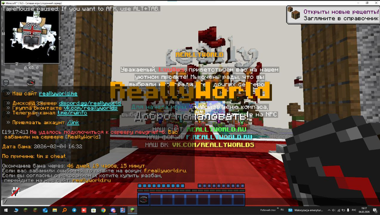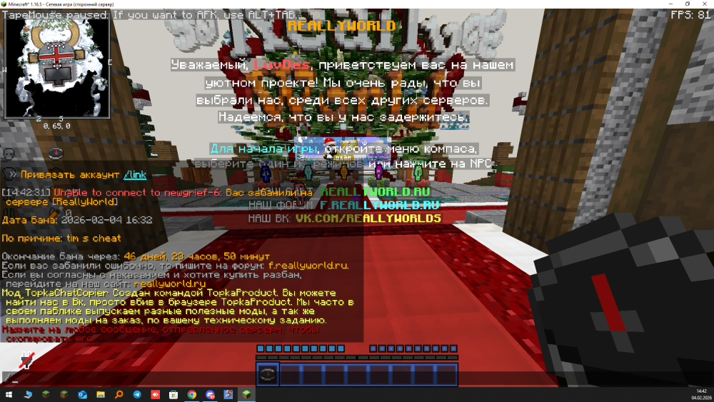 Ваш ник: LuvDes Дата нарушения: 04.02.26 Суть нарушения: Меня забанили без причины, хотя этот аккаунт постоянно находится на АФК-фарме. Номер грифа и режим гриферского выживания: 6 гриф, версия 1.16.5 Доказательства нарушения (фото/видео): Дополнительный комментарий: Меня забанили за тим-читы, хотя я просто стою на АФК-фарме и не взаимодействую с другими игроками. Я никогда не использовал запрещённые моды и не совершал нарушений с этого аккаунта. Очень прошу проверить бан и снять его, так как ситуация произошла несправедливо и мне неприятно видеть блокировку моего аккаунта.