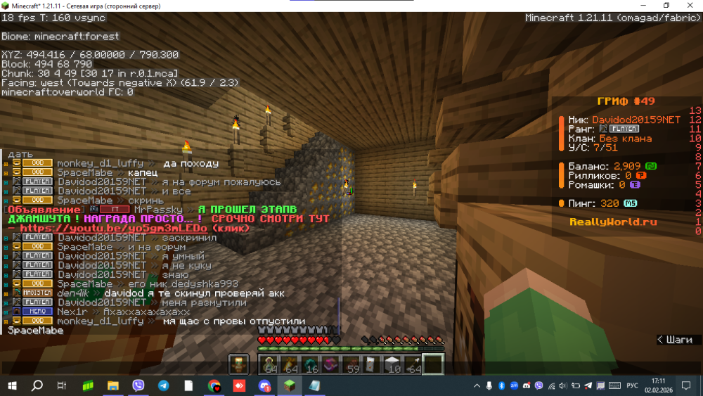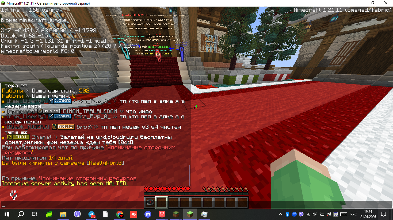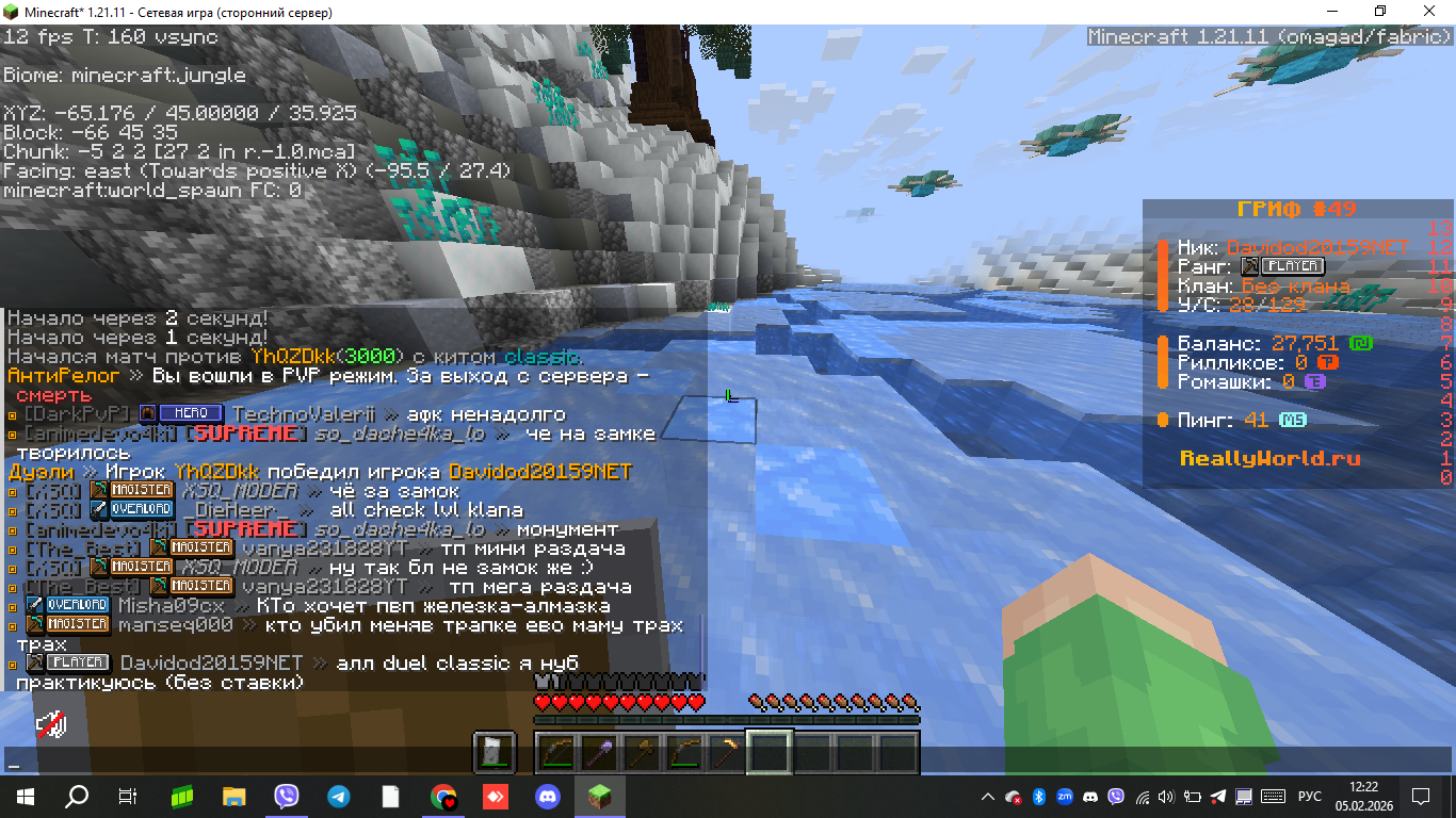 7. Ваш ник: Davidod20159NET Ник нарушителя: manseq000 Дата нарушения: 12:22 5 февраля Суть нарушения: Оскорбление родителей, ну или так сказать 4.4 На каком гриферском режиме было нарушение (MEGA-GRIEF/GRIEF-1.16) : 49 grief Доказательства о нарушении (фото/видео): Дополнительный комментарий: Если конечно вы можете сказать, подскажите пожалуйста, как скачать мод ЧатТайм на фабрике 1.21.11? Просто уточняеться то, что на репорта сообщение в чате нужен этот мод.