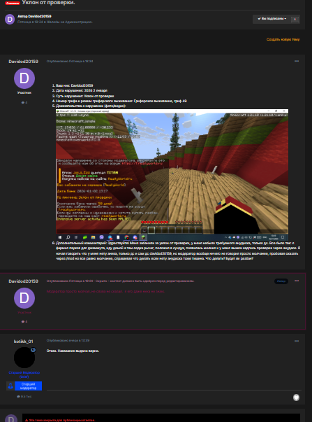 5. Ваш ник: Davidod20159 Дата нарушения: Точно сказать невозможно, но с 2025 года точно. Суть нарушения: Не проверка а просто баны за уклонение на проверке. Администратор/Группа администраторов просто ждет в невидимости, пока пройдет время, засчитываяся как уклон от проверки. Номер грифа и режим гриферского выживания: Все Доказательства о нарушении (фото/видео): Точных доказательств нету, как это происходит, к сожелению. Когда у меня будет достаточно доказательств, я повторюсь с доказательствами. Дополнительный комментарий: Администраторы ждут в невидемости или режим наблюдателя, пока пройдет 5 минут для бана. Когда спрашиваешь, говоришь, и вообще что либо угодно, молчание. Они не отвечают, что делать если нету анудеска, они не отвечают что делать вообще. Чтобы не спросил молчание. Я вижу, что у многих такая ситуация. У моего друга, на форуме вижу тоже такое пишут. Возможно это баг в связи с новой версии. Скорее всего будет отказ иза или не по форме или недочтаточно доказательств, или нарушений нету, но когда у меня появяться доказательства, я повторюсь (не как флуд,а через время.)
