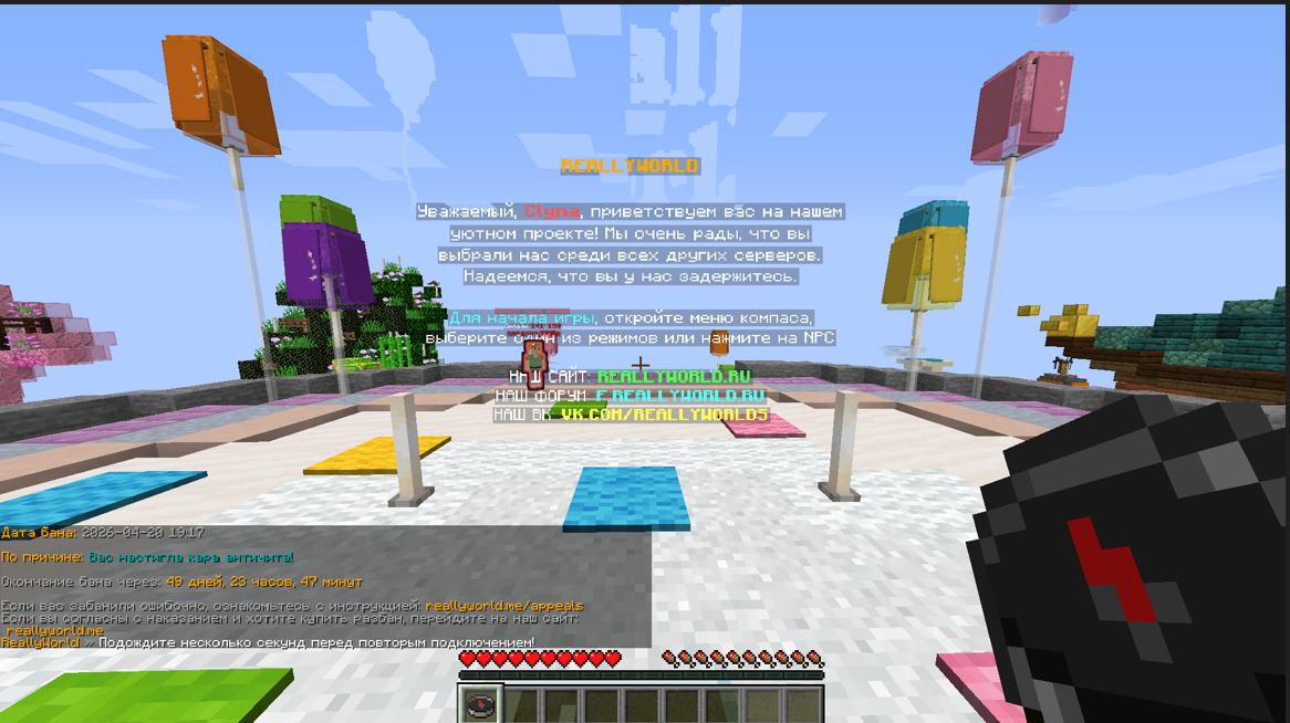 Суть нарушения:забанил просто так, я стоял в афк и слышу криты захожу в маин а меня он просто в инвизке убивает я пытаюсь убежать а он просто меня киляет каким то мечом на остроту 1000 и банит за карму античита я просто в шоке просто так меня забанили прошу принять меры и разбанить меня и вернуть сет ведь он стоит не дорого с шаром пасхи