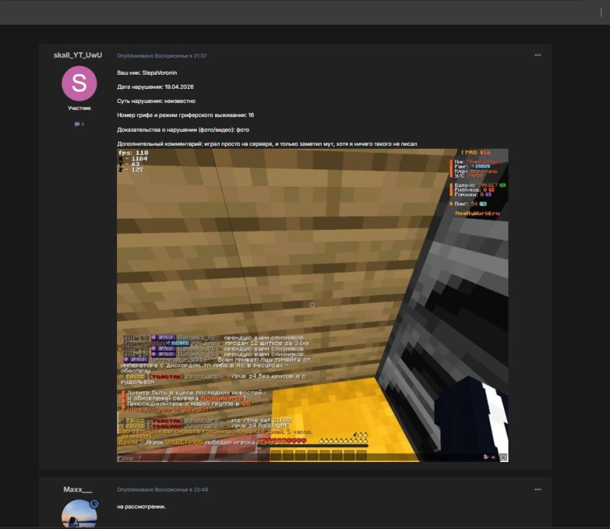 2. Ваш ник:StepaVoronin Дата нарушения:19.04.2026 Суть нарушения:Модератор форума "Maxx_" написал в воскресенье что на рассмотрении, уже пятница но ответа не поступило, скорее мут будет не активный чем он решит ответить. Номер грифа и режим гриферского выживания:16 Доказательства о нарушении (фото/видео): Дополнительный комментарий: