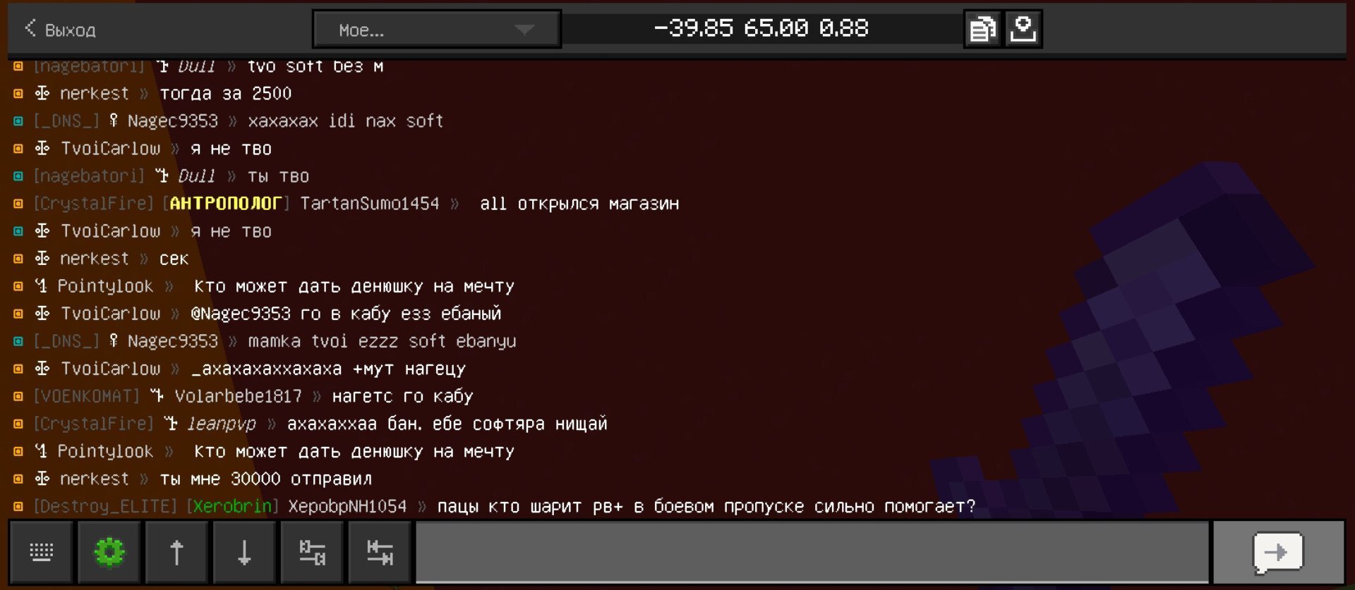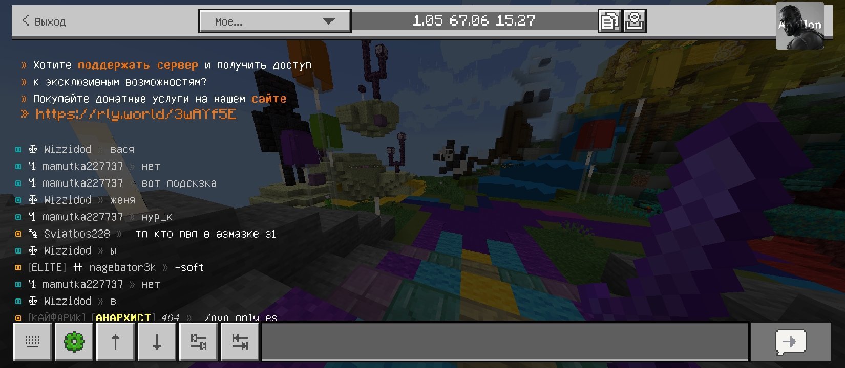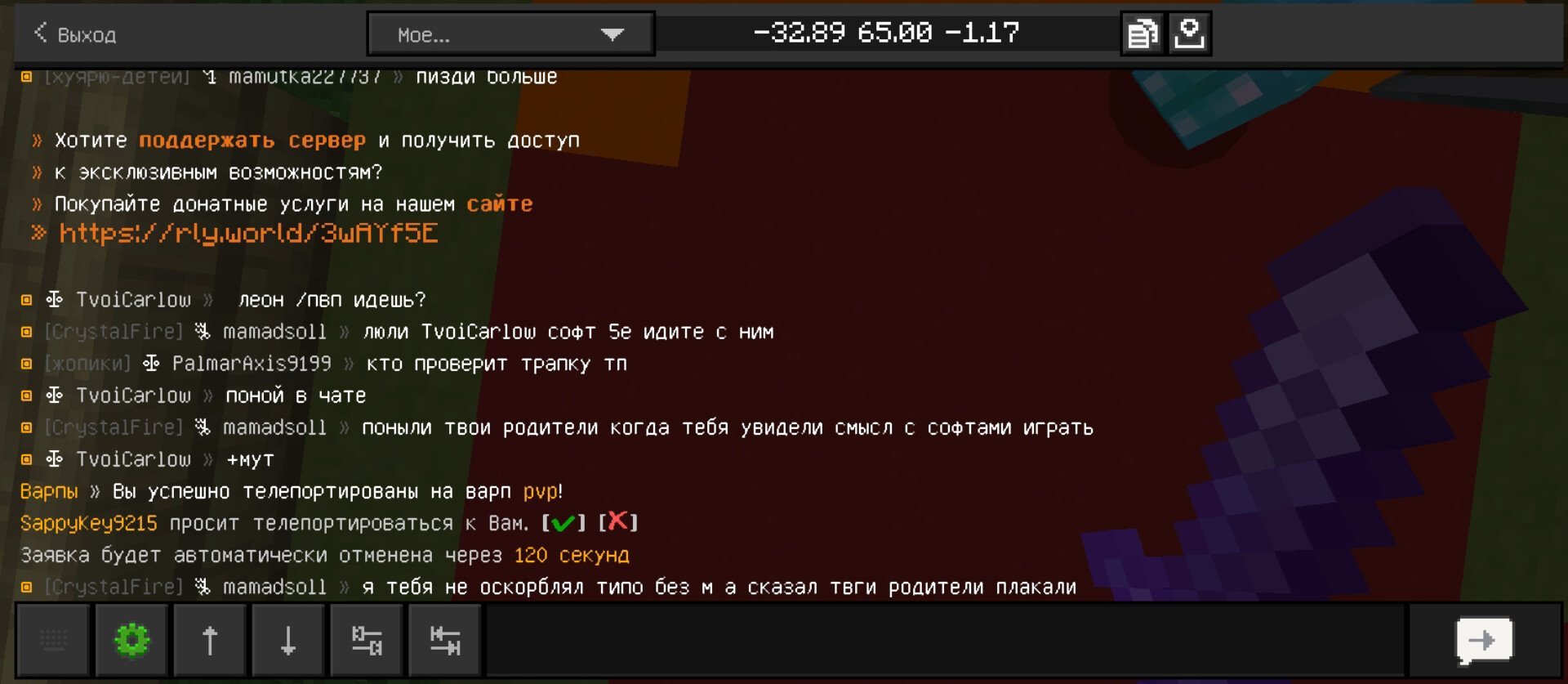 4. Ваш ник: Wizzidod Ник нарушителя: mamutka227737 Дата нарушения: Суть нарушения: провокация игроков на нарушение правил сервера (пытался заставить меня написать: нурик) На каком гриферском режиме было нарушение (MEGA-GRIEF/GRIEF-1.16) : бедрок 1 Доказательства о нарушении (фото/видео): прикрепил Дополнительный комментарий: этот даун только и может на слова скамить
