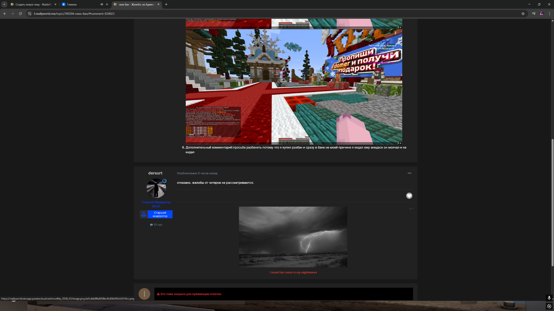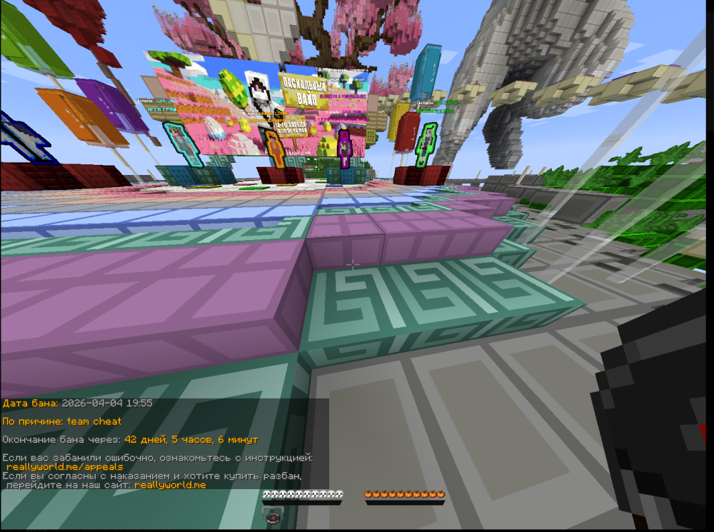 Ваш ник:bogswag Дата нарушения:04.04.2026 Суть нарушения:кароче я пехался с типами даже не пехался удара им не дал я убегал и багом попал через барьер то есть меня не тепала обратно из за кт и после этого бан прилетел за читы и тимов забанили за тим чит Номер грифа и режим гриферского выживания:54 Доказательства о нарушении (фото/видео): Дополнительный комментарий: