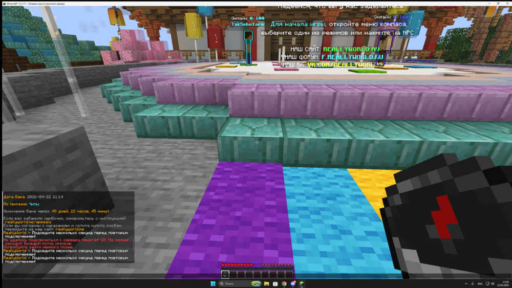 Ваш ник:bogswag Дата нарушения:22.04.2026 Суть нарушения:читы Номер грифа и режим гриферского выживания:25 Доказательства о нарушении (фото/видео): Дополнительный комментарий:я дуэлился с типом я хз были у него читы или нет но забанили меня я без читов был
