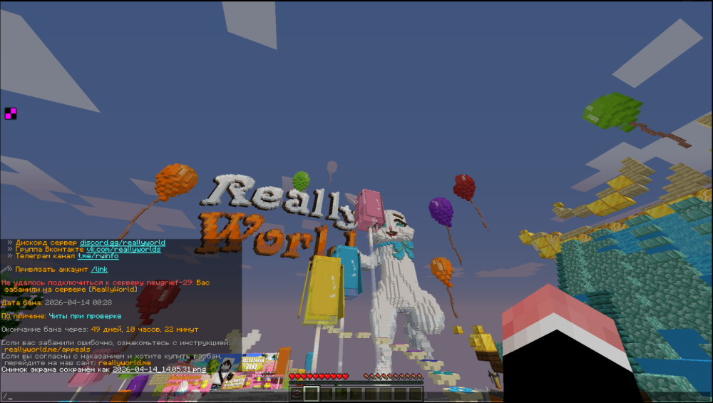 Ваш ник:bogswag Дата нарушения:16.04.2026 Суть нарушения:я стоял афк хотел пофармить яица прихожу я в хабе захожу на гриф и бан за уклон от проверки а я поставил автокликер чтоб не кикнуло в итоге в бане отлично вообще Номер грифа и режим гриферского выживания:54 Доказательства о нарушении (фото/видео): Дополнительный комментарий:выдать пред модеру и разбанить меня