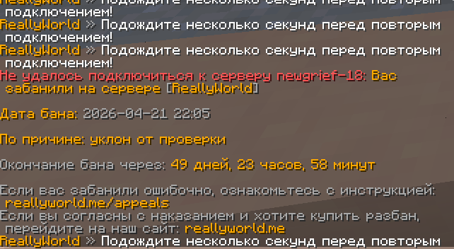 Ваш ник:Sunar_ Ник нарушителя:dersurtДата нарушения 21 04 2026 Суть нарушения: Ban уклон от проверки На каком гриферском режиме было нарушение (GRIEF-1.16 36) : Доказательства о нарушении (😞 Дополнительный комментарий:у модера не работал аник так вот он пишет дс кидай я пишу сли впн включю то кикнет потомучто с другого айпи ну я ливнул и бан