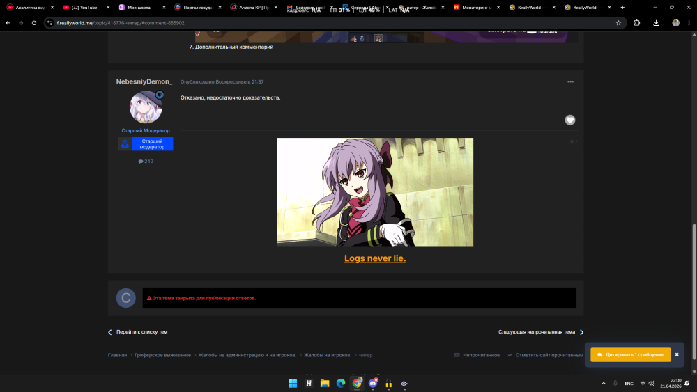 Дополнительный комментарий, ссылка на жалобу (если есть):ОН ПРИКРЫВАЕТ ЧИТЫ!