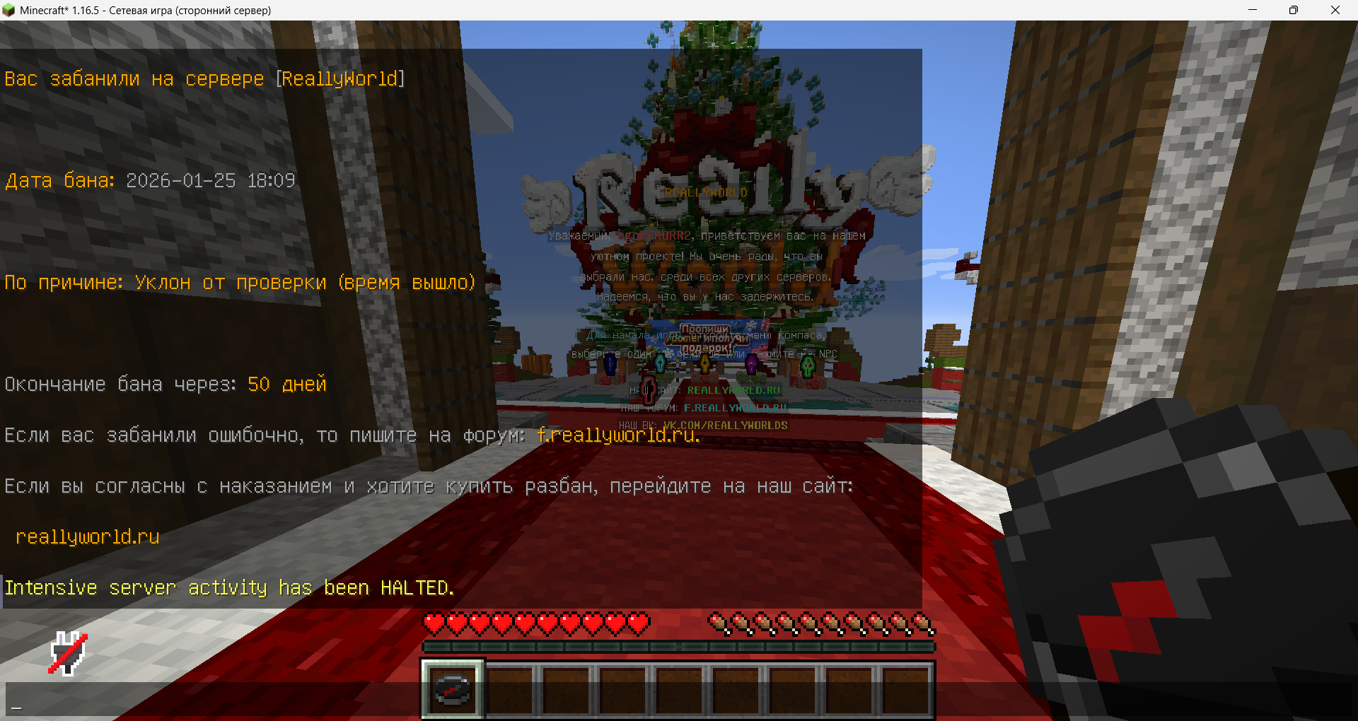 здравствуйте мой ник:egorERORR2 бан произошёл в 2026 01 25 18:06 по мск нарушение уклон с проверки 29 гриф гриф выживание. Я давал свой дискорд потому что анедеска у меня к сожелению не было он мне не что не писал (хотя я написал свой дискорд) я ждал заявку но 0 эмоций у него (что я делал 5 минут назад до этого просто покупал незеритовую броню на акционе потому что купили у меня шар огня я его выбил в новогоднем кейсе потом пошел на варп пвп сфоткать броню и показать друзьям но меня вызвали на проверку хотя я даже не чего не делал) (также было и с другим аккаунтом с ником egorERORR1) прошу меня разбанить!!