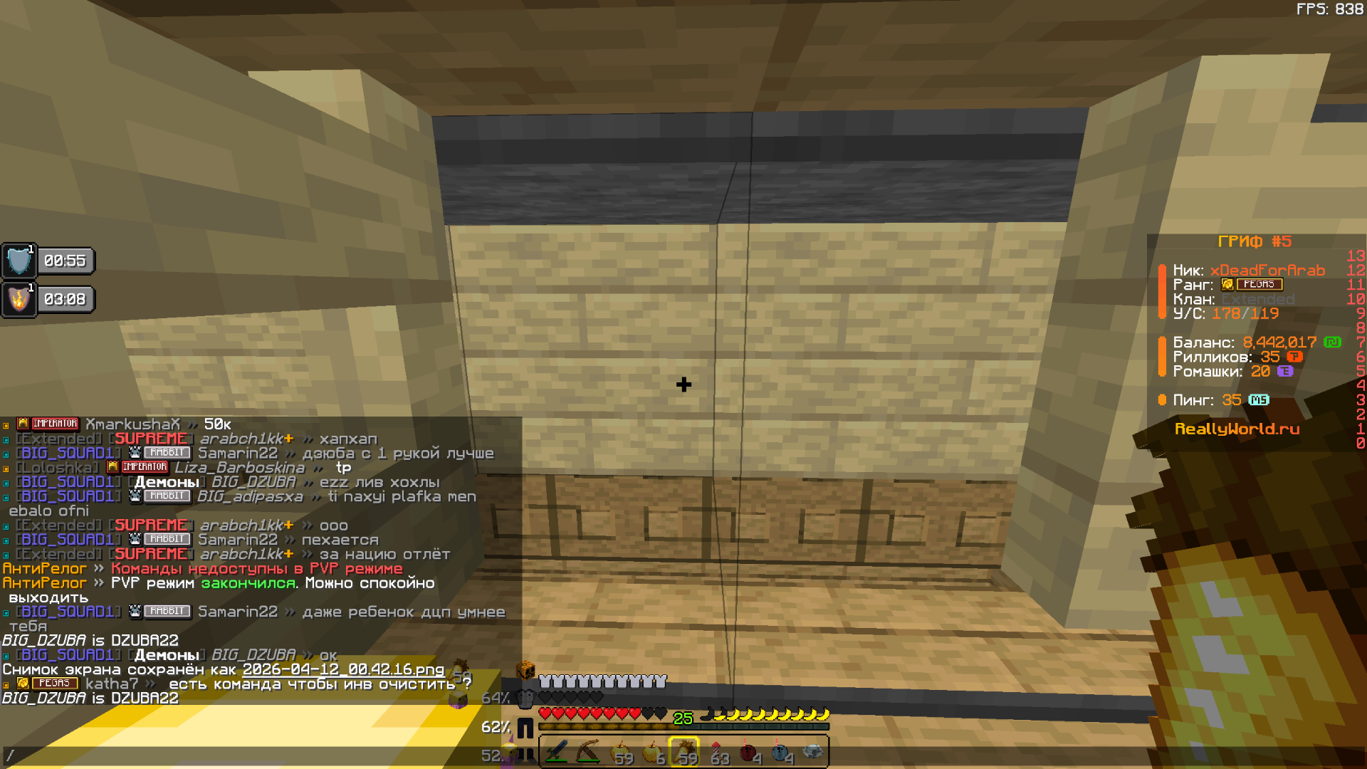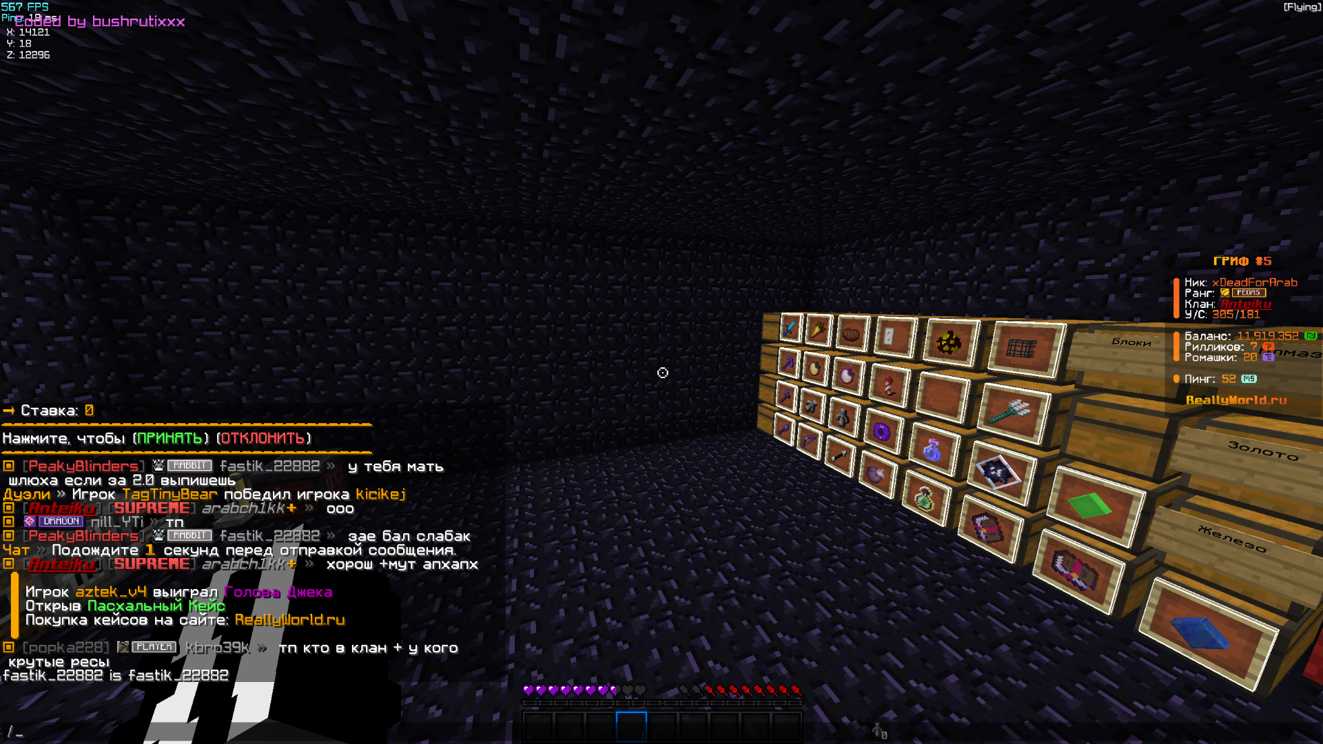Ваш ник: xDeadForArab Ник нарушителя: NameGlebon и KissMeForever Дата нарушения: 24.02.2026 Суть нарушения: Читеры На каком гриферском режиме было нарушение (MEGA-GRIEF/GRIEF-1.16) : гриф-5 Доказательства о нарушении (фото/видео): Видео Дополнительный комментарий: прошу забанить + снести хату под 0 сетнуть