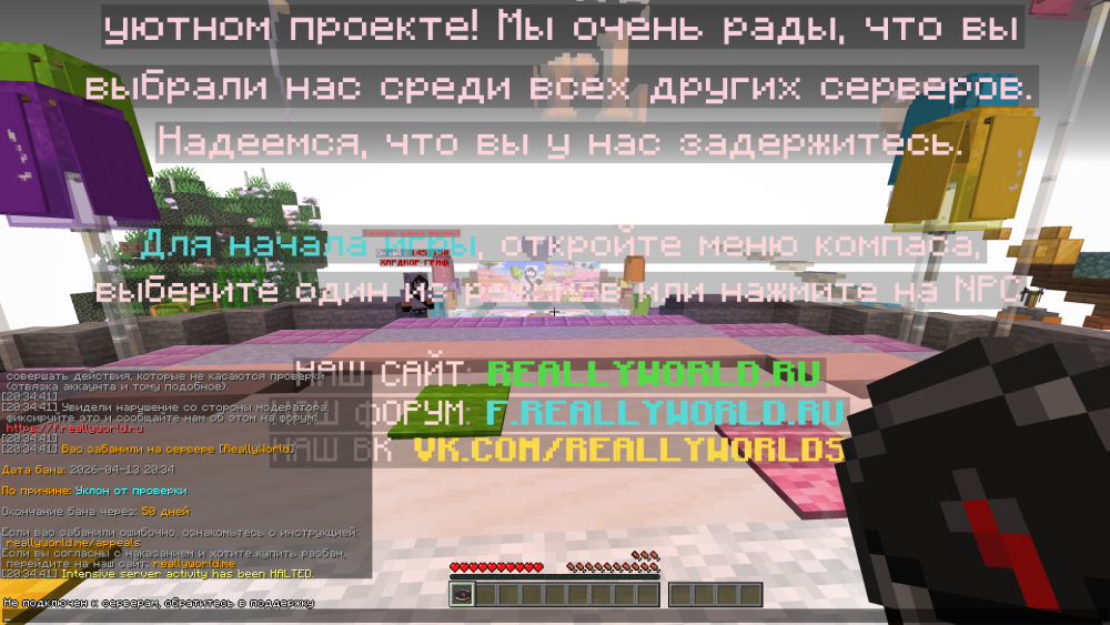 3. Ваш ник: _V1nd_ Дата нарушения: 13.04.2026 Суть нарушения: забанили за уклон проверки, хотя я скинул анидеск Номер грифа и режим гриферского выживания: 69 Доказательства о нарушении (фото/видео): нету, но это скорее всего ручной модер читера, который доставал меня целый день, почему-то вызвали на проверку не его, а меня, и пришел он ко мне только тогда, когда меня вызвали на проверку, его ник полностью не помню, но там было igor_1(тут цифры еще), у него император Дополнительный комментарий: я написал это в доказательстве