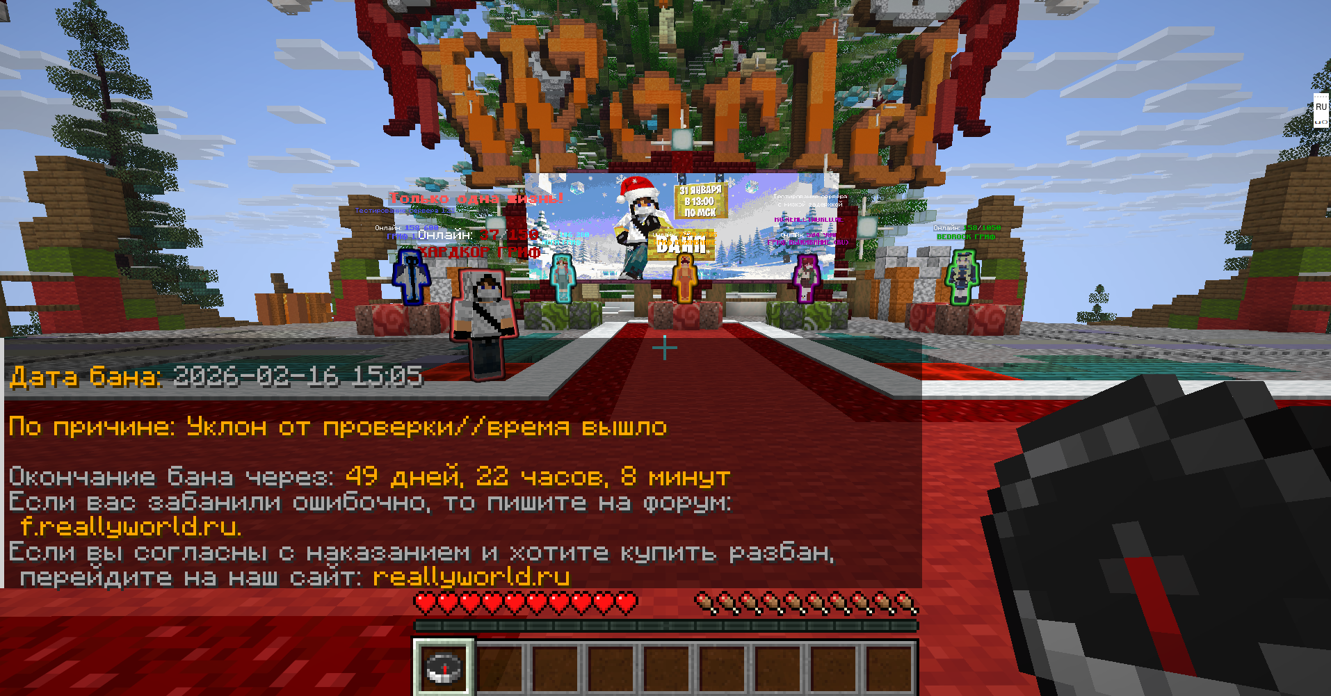 Форма подачи жалобы на мут/бан от Анти-спамма. 1. Ваш ник: FolksyRock79263 2. Дата блокировки, которая указана в наказании: 50 дней 3. На каком гриферском режиме было нарушение: 7 гриф 4. Доказательства о нарушении (скрин блокировки) 5. Дополнительный комментарий (обязательно описывайте последние действия перед баном): Просто играл пошёл я на пвп получил вещи из сундука встал на сундук и проверка на читы, я писал модератеру он игнорил и его даже не видно было потом он просто забанил меня