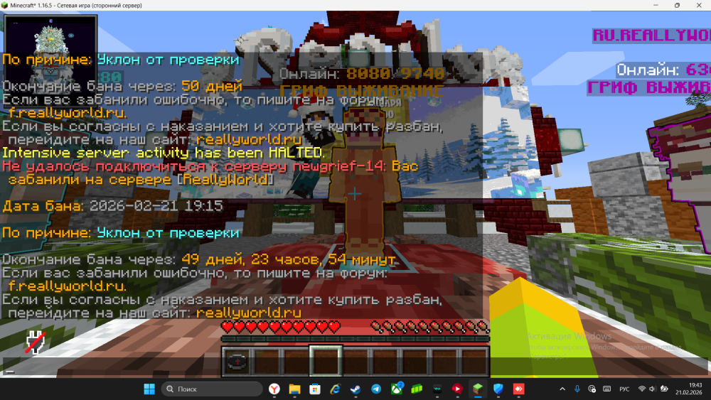 7. Ваш ник: Netu4 Дата нарушения: 2026-02-21 19:15 Суть нарушения: Уклон от проверки Номер грифа и режим гриферского выживания: ГРИФ ВЫЖИВАНИЕ, Гриф #14 Доказательства о нарушении (фото/видео): прикрепленно ниже Дополнительный комментарий: меня вызвали на проверку через Anydesk но у меня его не было, Я пытался его скачать и написал что устанавливаю его но мне высветилось в чате что у меня есть 5 минут для отправки кода доступа Anydesk. В конце концов я отлетел в бан на 50 дней. Я установил Anydesk и готов пройти проверку если она требуется.