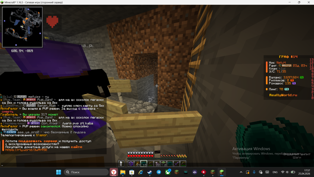 1. Ваш ник:Netu4 Ник нарушителя:aaa_ya_pro2 Дата нарушения:25.04.2026 Суть нарушения:оскорбление родного человека На каком гриферском режиме было нарушение (MEGA-GRIEF/GRIEF-1.16) : Grief 14 Доказательства о нарушении (фото/видео): прикреплено ниже Дополнительный комментарий: мы рейдили двух чуваков и один из них написал в чат это