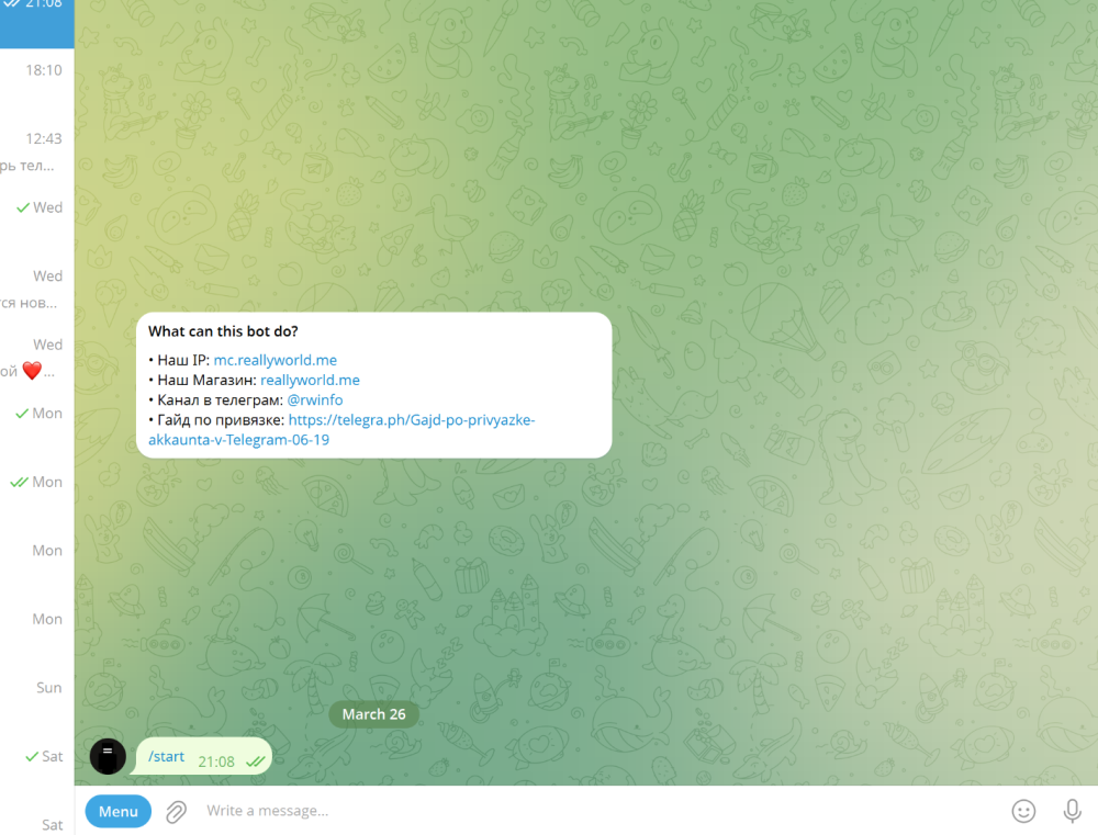 4. Ваш игровой никнейм:MrGamer_YT2 На каком режиме вы нашли этот баг:Telegram Как обнаружить этот баг; опишите ваши действия: написать /start в телеграм Полное описание бага:Я написал /start в телеграм и мне не ответело Скриншоты/видео-записи бага (если имеются):Скриншоты