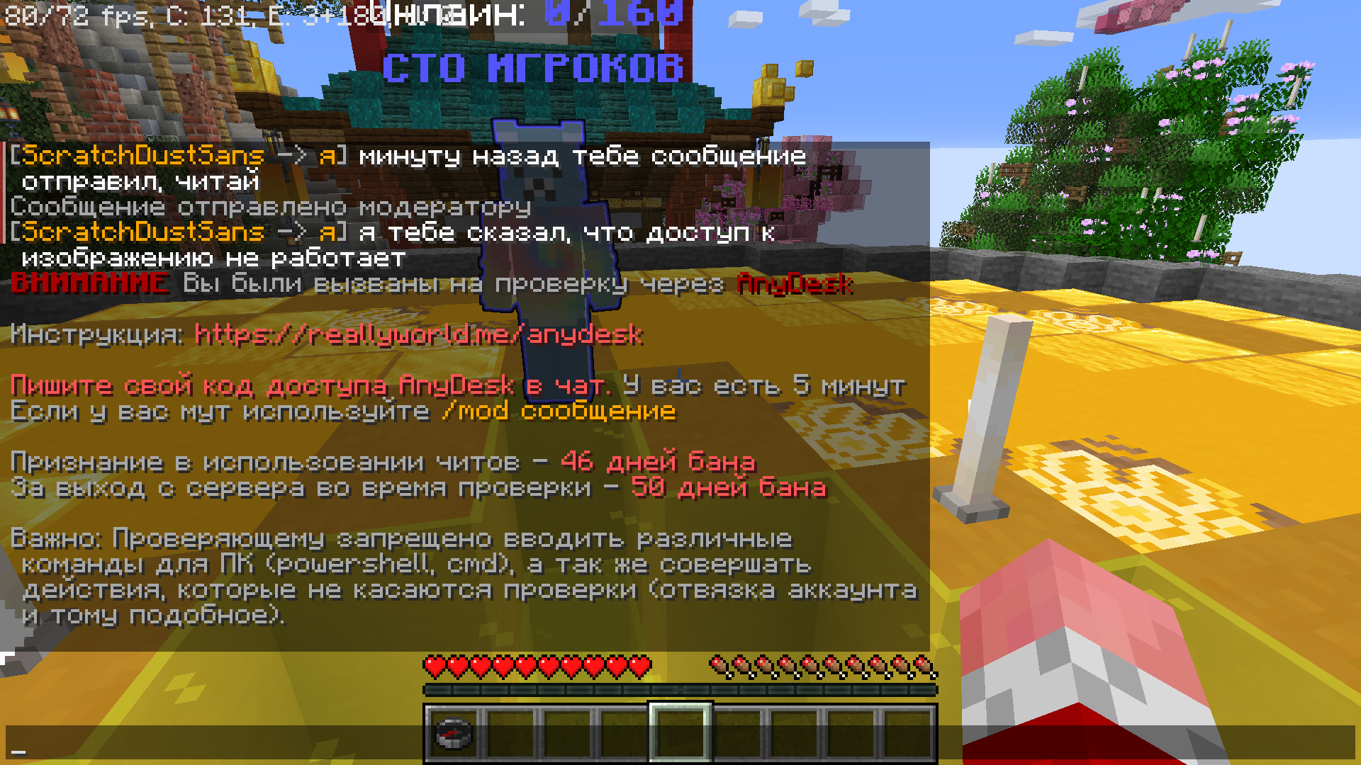 Дополнительный комментарий: пишу 2 раз! Я кинул модератору код анидеск, он поключился и написал что у него нет достапа к изображению. На видео показиваю что анидеск у меня работает! И проблемы именно у модератора с подключением! Потом он мне написал что у меня 3 мин.на фикс, я спросил как это сделать. И в итоге забанил на 50 дней по причине: уклон от проверки. Пожалуйста поймите мою проблему. Простите что 3 раза писал просто попросили добавить бан-лист:(