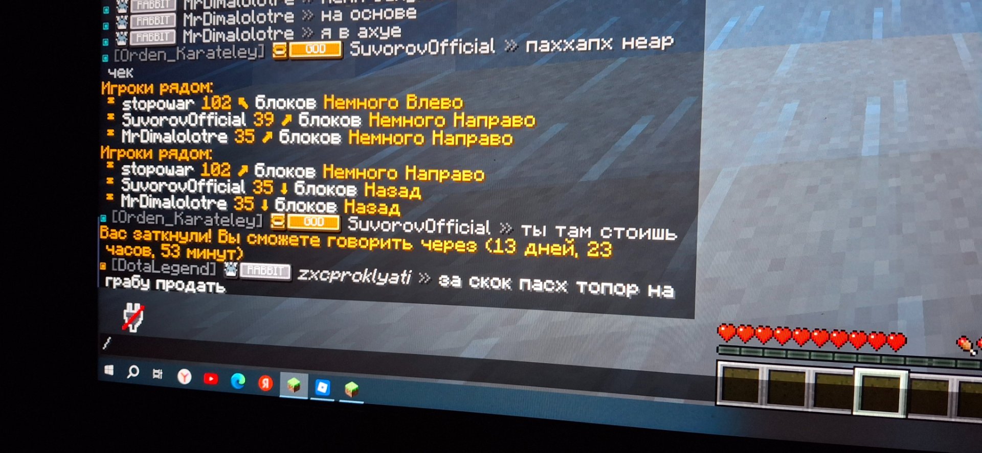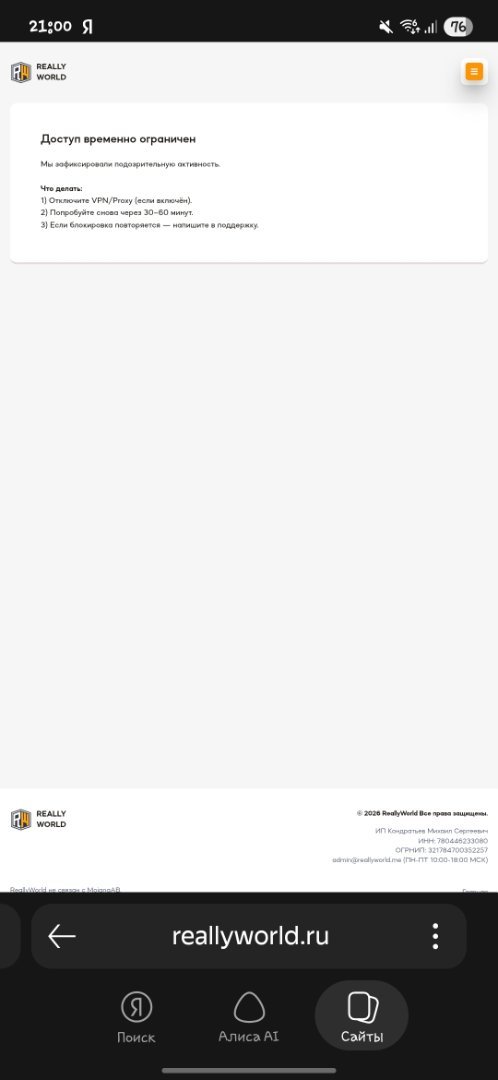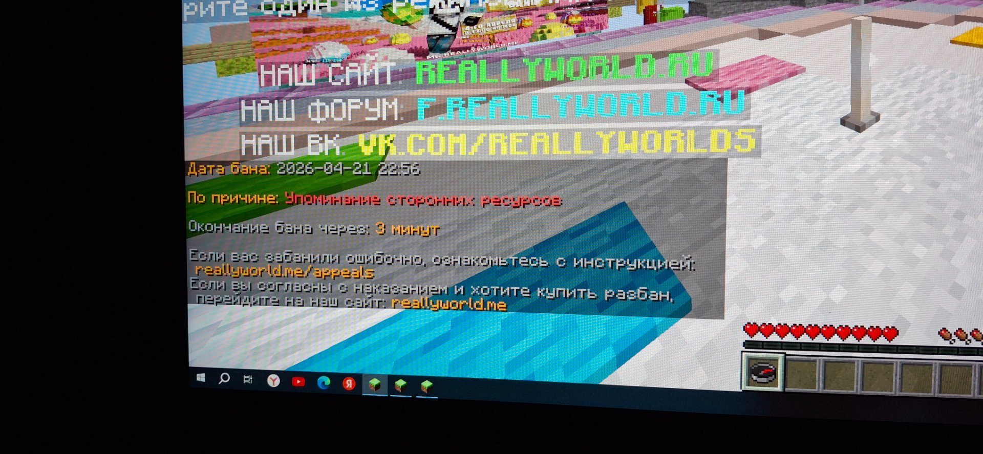 3. 1.Dimalolotre 2. 17 апреля 2026 года 3.14 гриф 4.скрин внизу 5. У друга была куча пинга я ему в чат гле видел только он рядом предложил зайти с помощью айпи mc.reallyworld.ru а меня забанили на 5 мин и мут на 14 дней