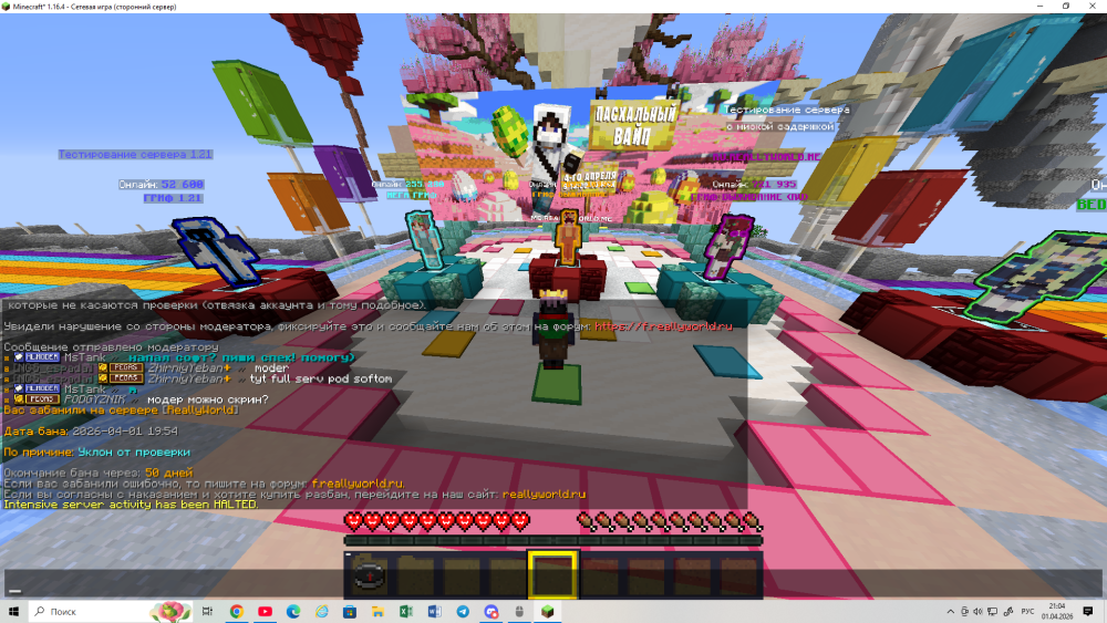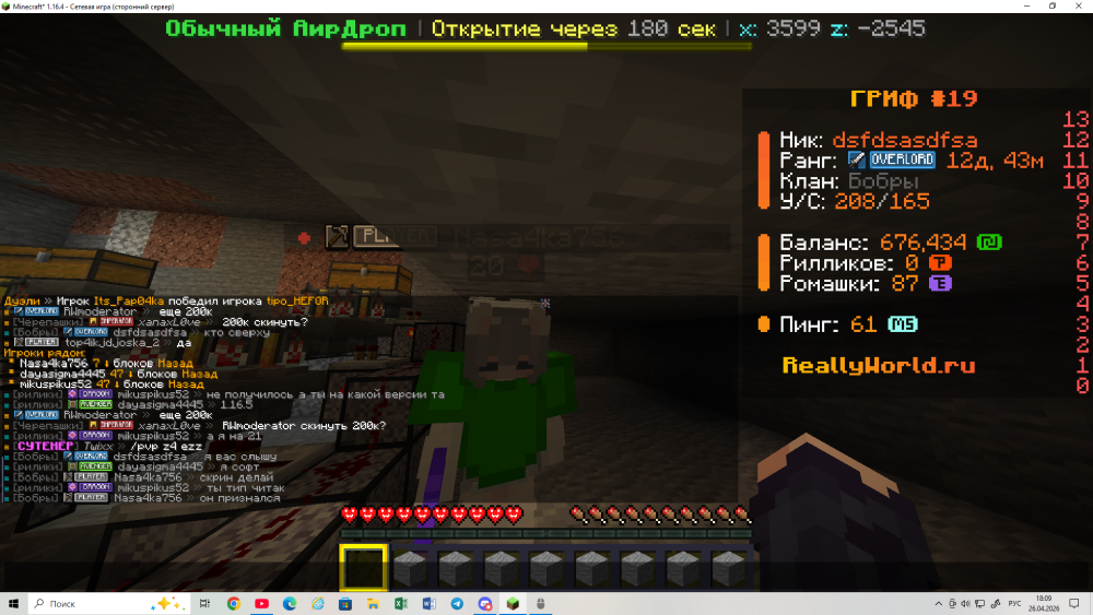 1. Ваш ник:dsfdsasdfsa Ник нарушителя:dayasigma4445 Дата нарушения:26.04.2026 Суть нарушения:читы На каком гриферском режиме было нарушение (MEGA-GRIEF/GRIEF-1.16) : гриф выживание 19 Доказательства о нарушении (фото/видео): Дополнительный комментарий:признание в читах