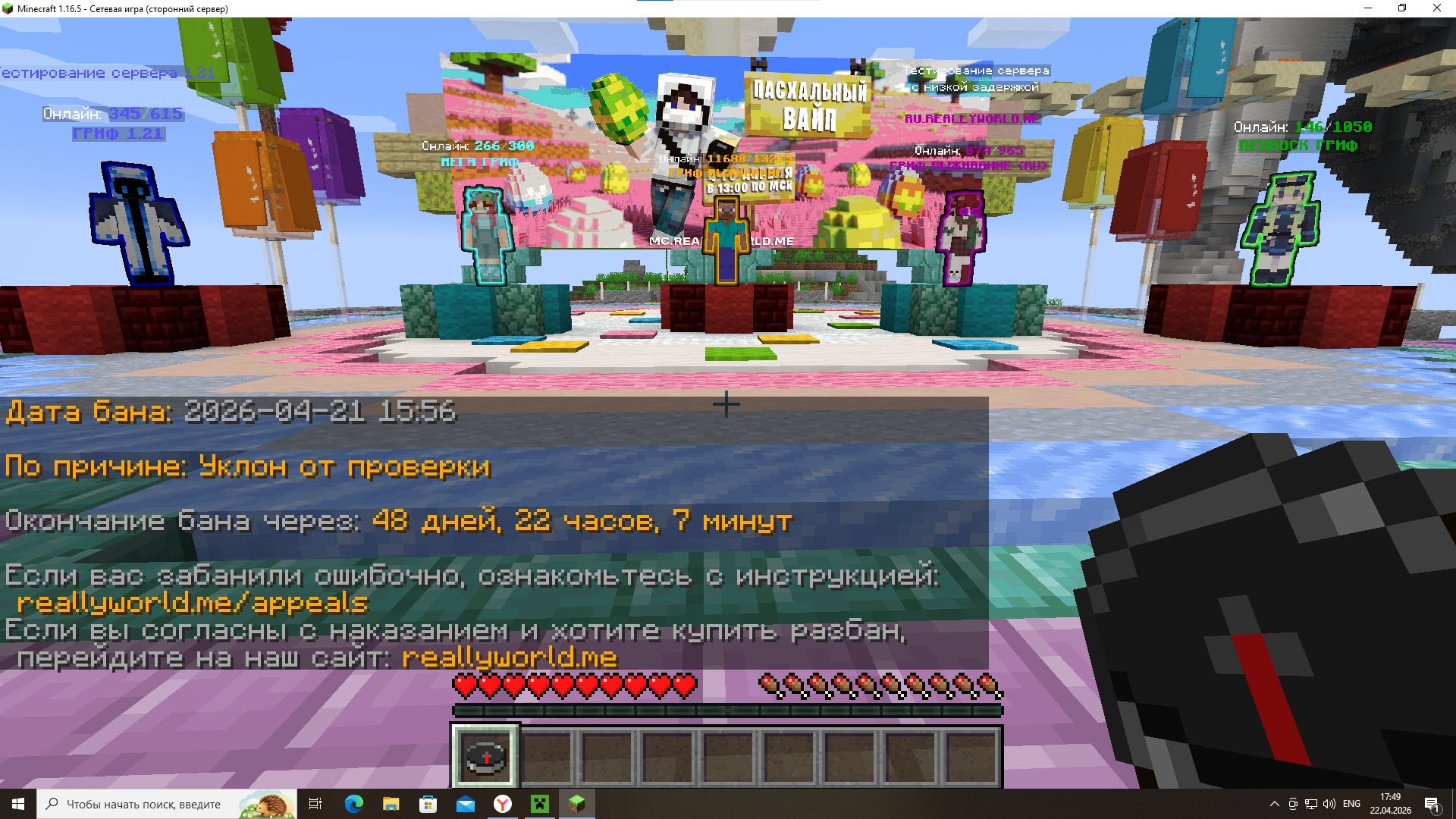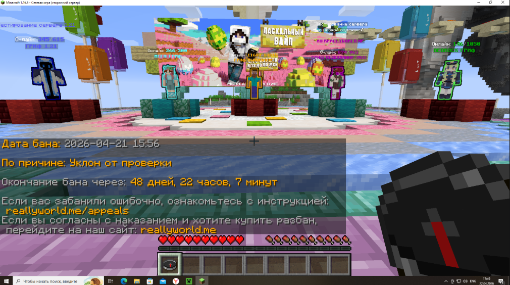 1. homchik67 21.04.2026 где-то в 15:30 админ игнорил, после вопроса здесь ли он я улетел в бан за "уклон от проверки" 34 гриф обычного гриферского выживания я играю на риалли ворлд не так давно и на проверку попадаю первый раз и я не знал что такое энидеск ну настолько сложно было сказать мне что это такое и как это скачать?