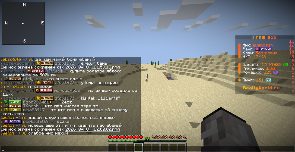 2. Ваш ник: ayanossq Ник нарушителя:obcolute Дата нарушения:07.04.2026 [20:00-20:18] Суть нарушения:оскорбления родни и не только. На каком гриферском режиме было нарушение (MEGA-GRIEF/GRIEF-1.16) : GRIEF-1.16 Доказательства о нарушении (фото/видео): фото прикрепил. Дополнительный комментарий: Он переодически менял ники, чтобы избежать наказания. Если это возможно, то проверьте логи. Изначально через команду /nick у него стоял ник: "absolute".