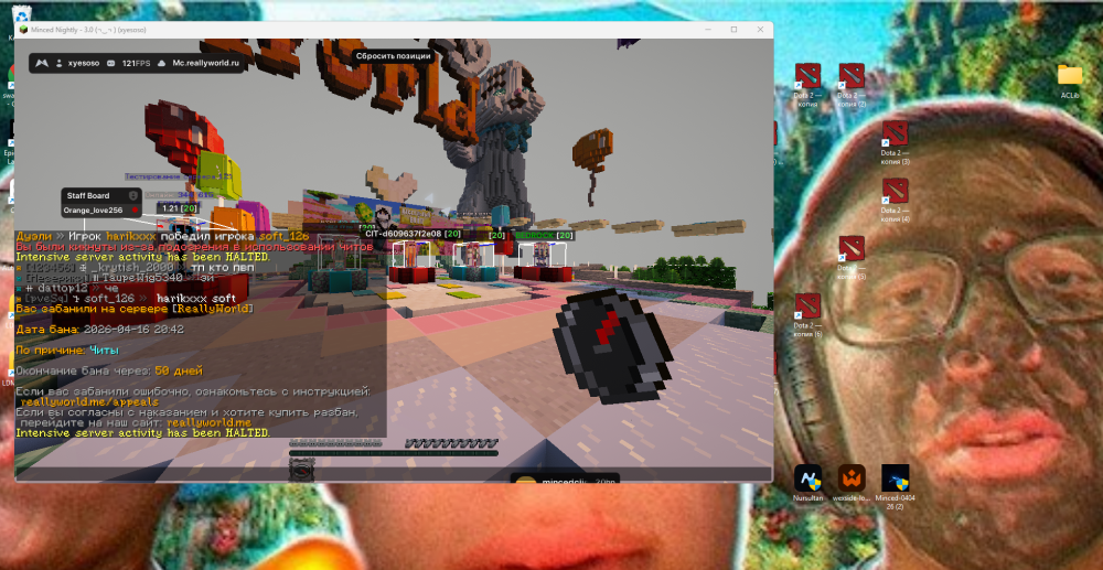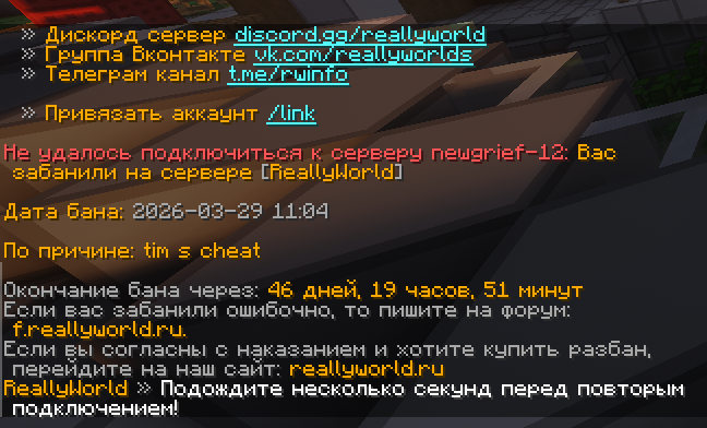 на рили ворлде я всегда играю соло, тимов с читами никогда не было, сегодня ночью познакомился с каким то рандомом, нормальный человек, играет без читов( он мне показывал на вебке) и больше за данный вайп ни с кем я не играл в команде, спрашивается какой у меня есть тиммейт с читами, ник тима которого я сегодня встретил obsrar и как бан 46 дней а не 50 если сегодня в 4 утра спокойно играл, прошу разбанить
