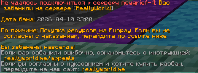 5. Ваш ник: Дата нарушения: 2026-04-10 23:00 Суть нарушения: покупка ресурсов на fun pay Номер грифа и режим гриферского выживания: 4 гриф Доказательства о нарушении (фото/видео): 6. Дополнительный комментарий: я зашел не сервер даже не хом не тп и сразу банят, и меня проверяли на пробе и нашли покупку разбана и кейс доната я написал модеру он сказал что нет
