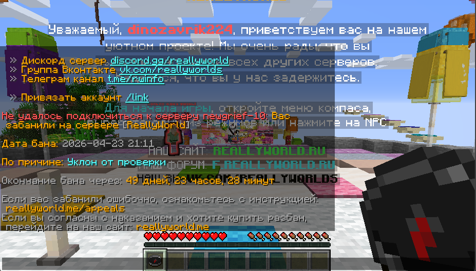 я dinozavrik224 вчера вечером в 23 ночи по мск ьыл забанет на 10гриф за читы без проверки на низ было так что я сдругом таргетил игрока fantocryt игрок пожалывался другу админу каторый забанил меня на 50 дней за читы без проверки на них я играю без читов , готов пройти проверку