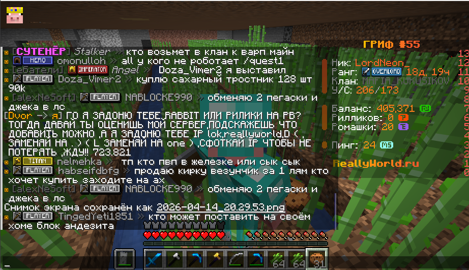 Ваш ник:LordNeon_ Ник нарушителя:bob_rob_buterbro Дата нарушения: 09.04.2026 Суть нарушения: Загнал в кабинку и убил за несколько ударов На каком гриферском режиме было нарушение (MEGA-GRIEF/GRIEF-1.16) : 55 Доказательства о нарушении (фото/видео): Дополнительный комментарий: Когда я был фулл лучшей незерке и с косой жнеца тотеми яблоки голова супер мена и кролика меня чел загнал в кабинку и убил все его удары были точными и попадали все я был забафан в силу 2 но ето не помогло он меня был за 4-5 сердец и убил я даже не успел нечего зделать ето было очень точно и по читерскому пожалуйста проверьте его