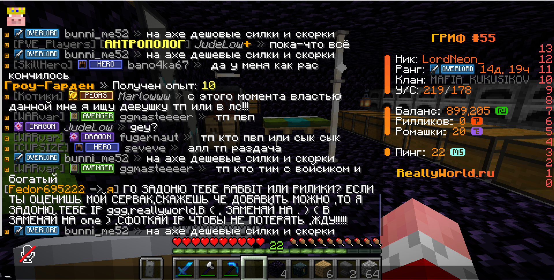 Ваш ник:LordNeon_ Ник нарушителя:Fedor695222 Дата нарушения:18.04.2026 Суть нарушения:игрок хочет заманить на сервак На каком гриферском режиме было нарушение (MEGA-GRIEF/GRIEF-1.16) :55 Доказательства о нарушении (фото/видео): Дополнительный комментарий: забаньте игрока он распостроняет свой сервер и хочет забайтить