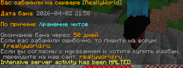 Здравствуйте. Я могу предоставить все для того что б я просто поиграл с кланом Мне етот Икс Рей не нужен и он у меня уже был Как я уже сказал я его только использовал на сервере с друзьями для тролинга а на сервере я играю чесно и то я не понимаю почему меня вызвали на проверку примерно тогда когда я 2 дня не был в шахте я просто отдыхал с друзьями и пелахся. Тем более не каких пвп читов у меня не нашли и не было а икс рей тут не причем Модер сам видел что Икс рей у меня в загрузках и очень давно был скачан но если я например скачал что то и удалил поскольку я очень давно на риливорлд не играл то ето не причина что нужно думать что каждий у кого есть что то незаконое нужно банить Важно! я не использую етот икс рей на етом сервере а в шахте я не был более 2-3 дня поскольку или не всегда играл или мне друг помогал выполнать задание Я хочу что б я услышал коректный ответ что и как нужно мне зделать что б доказать Пожалуйста розберитесь Мой ник: LordNeon