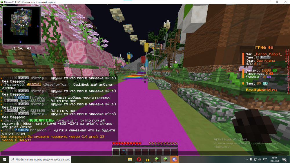 3. Ваш ник: _Deron_Rabbit_ Дата нарушения: 19.04.2026 Суть нарушения: нету причины Номер грифа и режим гриферского выживания: 6 Доказательства о нарушении (фото/видео): фото Дополнительный комментарий: хз я стоял на спавне афк с твинка и отошел на час и вижу мут на 15 дн хотя я нечего такого не писал чекните логи даже