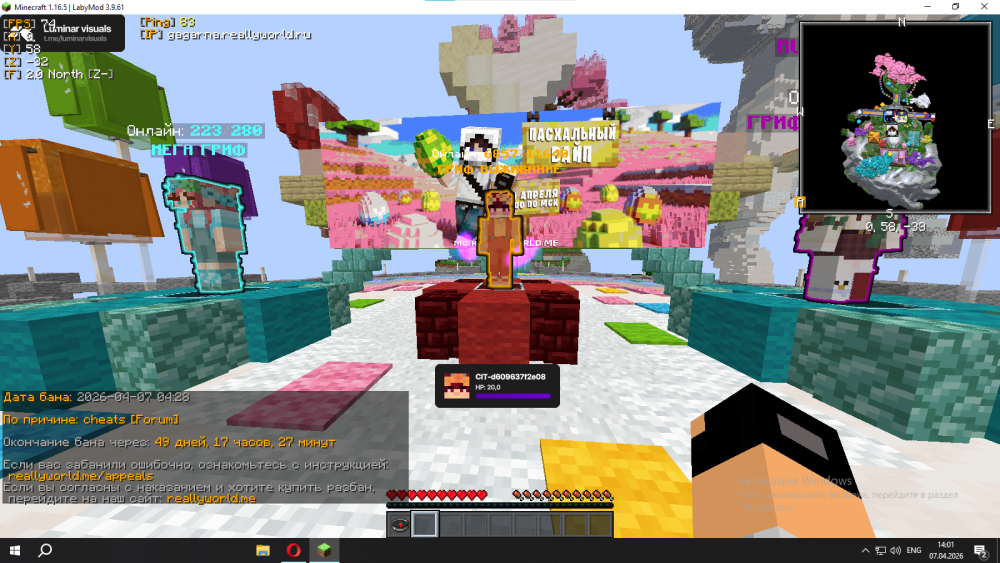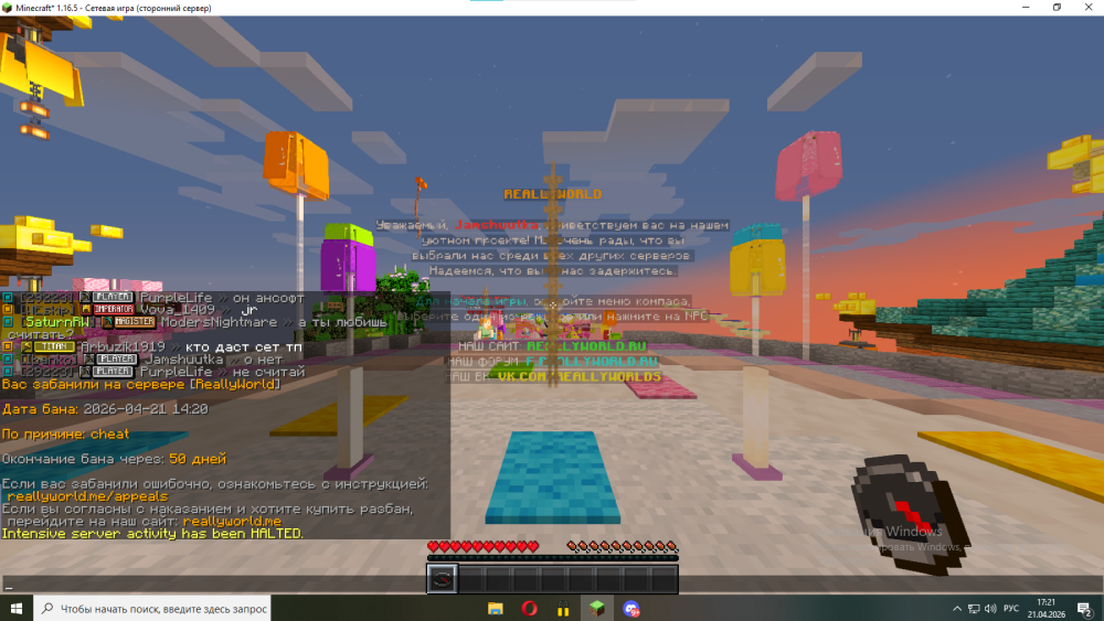 5. Ваш ник: polina_limbo Дата нарушения: 07.04.2026 Суть нарушения: читы форум Номер грифа и режим гриферского выживания: 17 (на данный момент 6) Доказательства о нарушении (фото/видео): прикрепил Дополнительный комментарий: я залетаю на варп, и начинаю убивать типов 3x1 и они прыгают в свои трапки, я пересмотрел рек в 0.1 замедлении и не нашел нечего подозрительного кроме элитра свапа, да я играл с ним но это бан 4 - 5 дней где то, я играл под пингом 200 - 300 потому а тпс где то 14 и из за этого есть недочеты в моих ударах и подозрения, ! МНЕ СКАЗАЛИ ОБРАТИТСЯ В ЖАЛОБЫ НА АДМИНИСТРАЦИЮ !