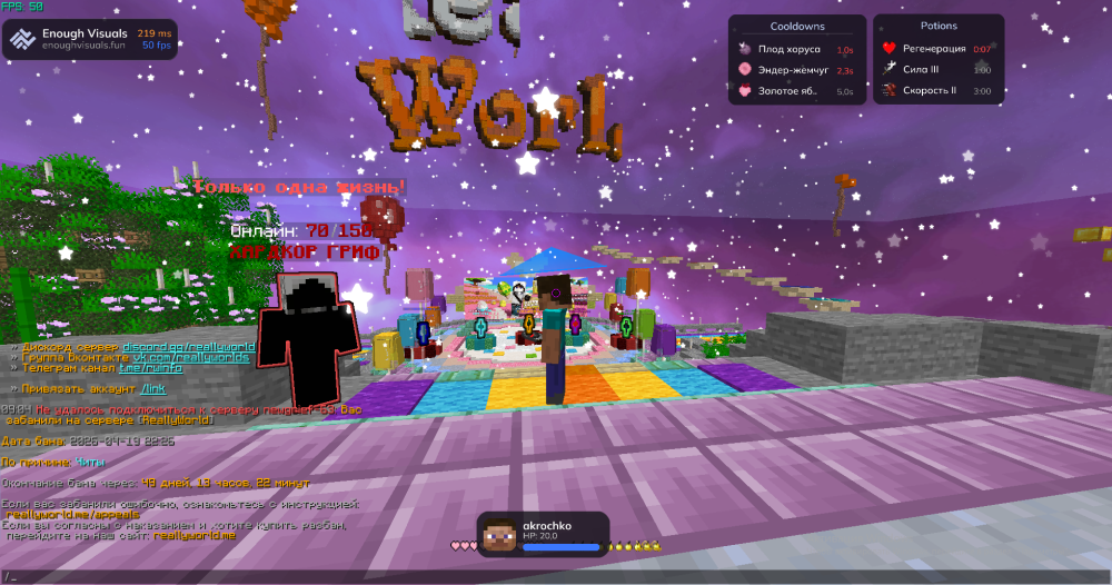 1. Ваш ник: akrochko Дата нарушения: 19.04 Суть нарушения: меня забанили за читы хотя я использовал не запрещенный мод Better Third Person Номер грифа и режим гриферского выживания: 63 Доказательства о нарушении (фото/видео): Дополнительный комментарий: меня забанили за читы а я использовал не запрещенный мод Better Third Person а бан был без проверки если есть рек то это видно что это этот мод я могу пройти прову