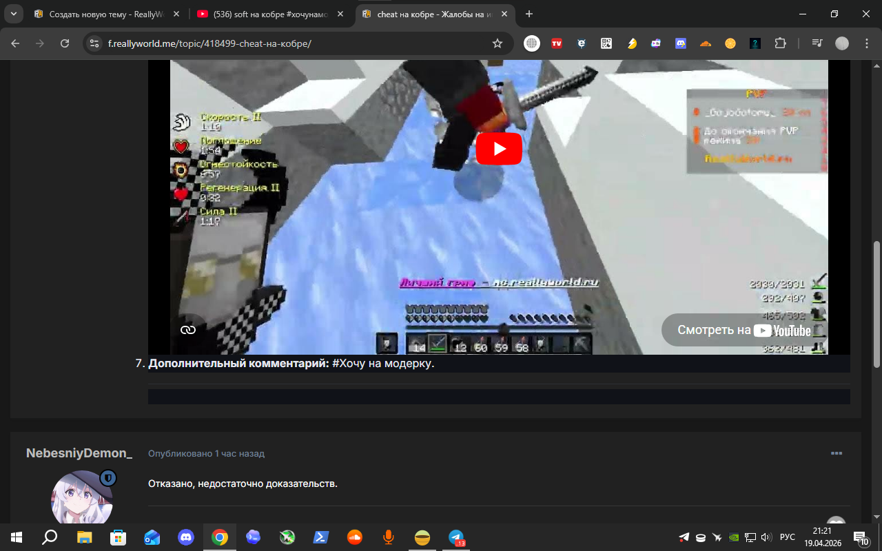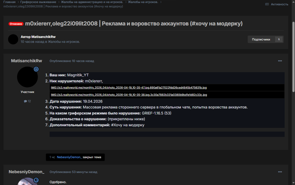 Я понимаю что ситуация выглядит серьёзно Я действительно старался помогать серверу подавал жалобы на читеров хотел развиваться в сторону модерации и приносить пользу проекту
