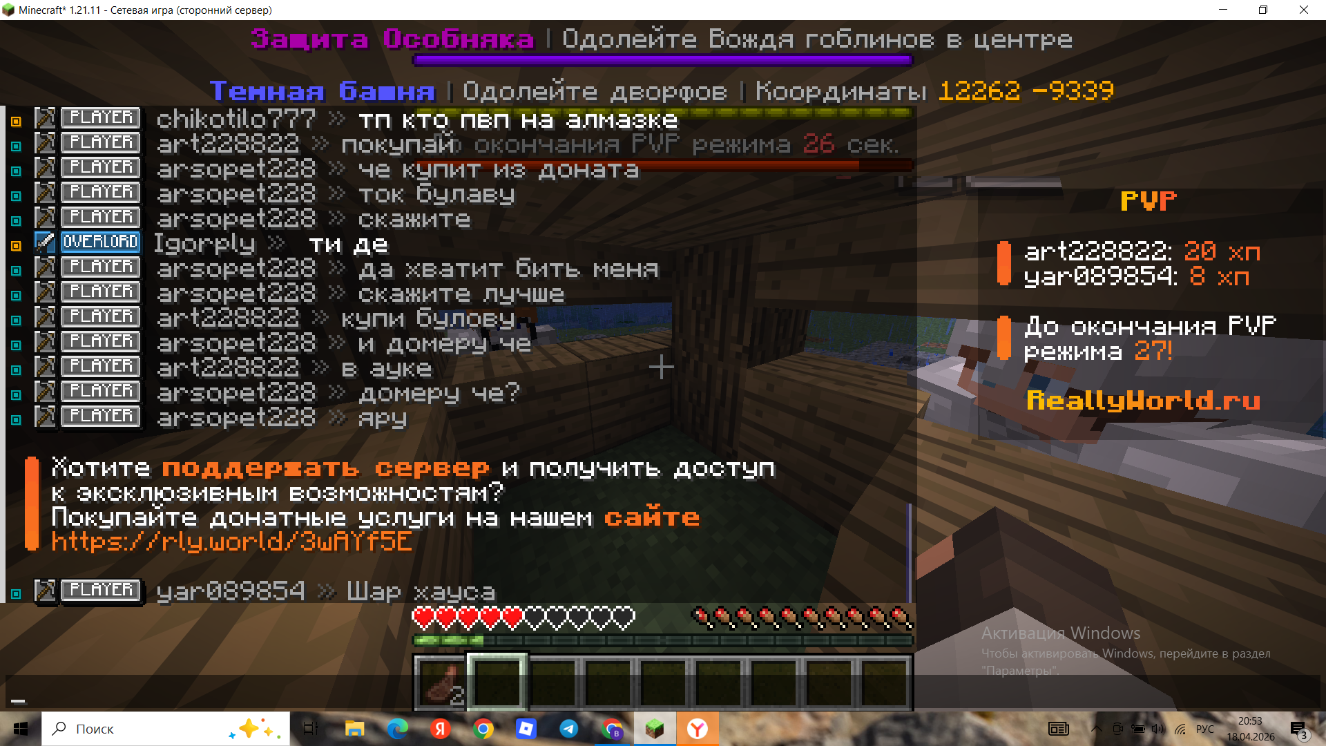 Суть нарушения: Вымогательство доната. Загриферили дом Зажали в ловушке, yar089854 держал в PVP, а art228822 требовал купить «Булаву» через сайт. Сервер: Гриф-2