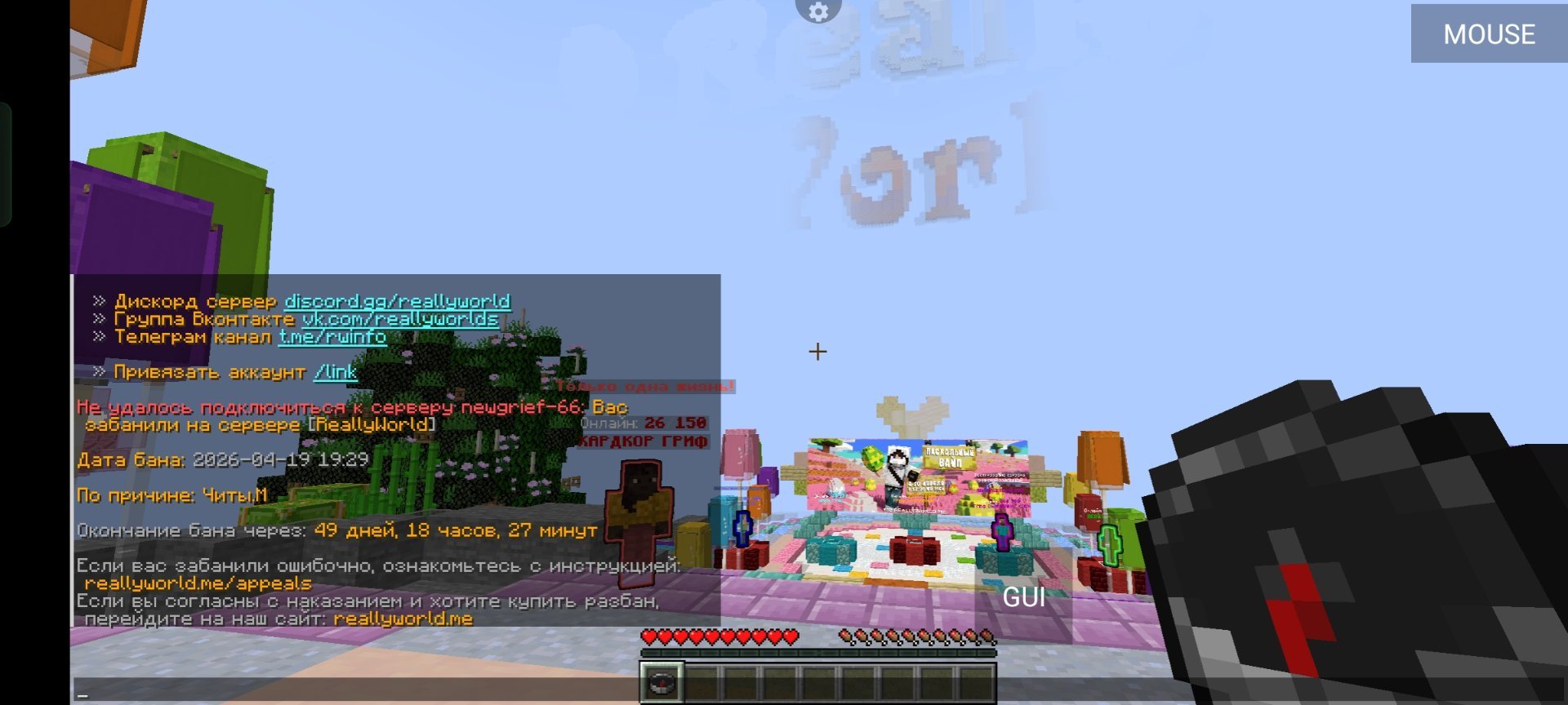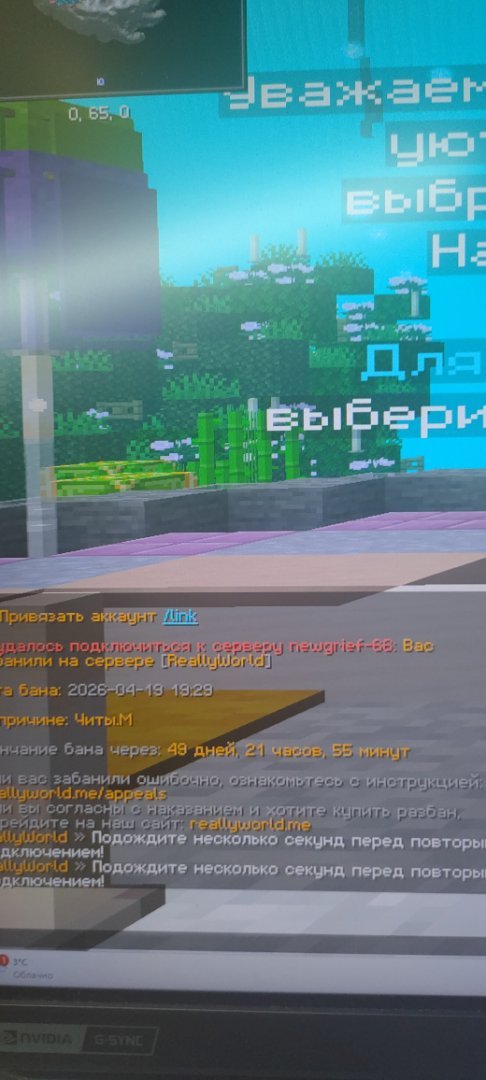 2. Ваш ник:pewwpe Дата нарушения:2026-04-19 19:23 Суть нарушения:Читы.М Номер грифа и режим гриферского выживания:66 Доказательства о нарушении (фото/видео): Дополнительный комментарий:я играл на рв ливнул поиграть в другую игру зашел и бан (скрин с телефона а так играю с пк)