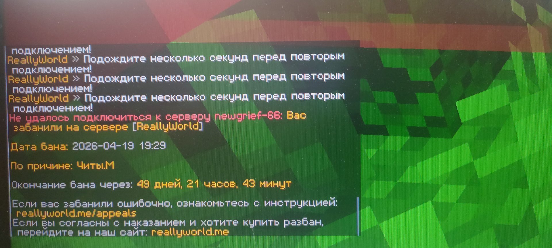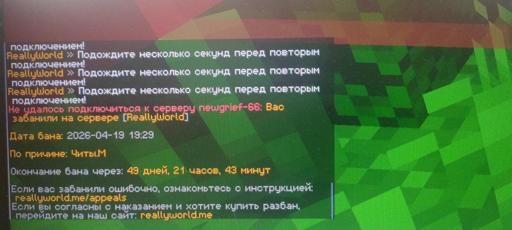 1. Ваш ник:pewwpe Дата нарушения:2026-04-19 19:29 Суть нарушения:Читы.М Номер грифа и режим гриферского выживания:66 Доказательства о нарушении (фото/видео): Дополнительный комментарий:я ливаю с рв что бы отдохнуть потом захожу и бан приходит через 30 мин после лива