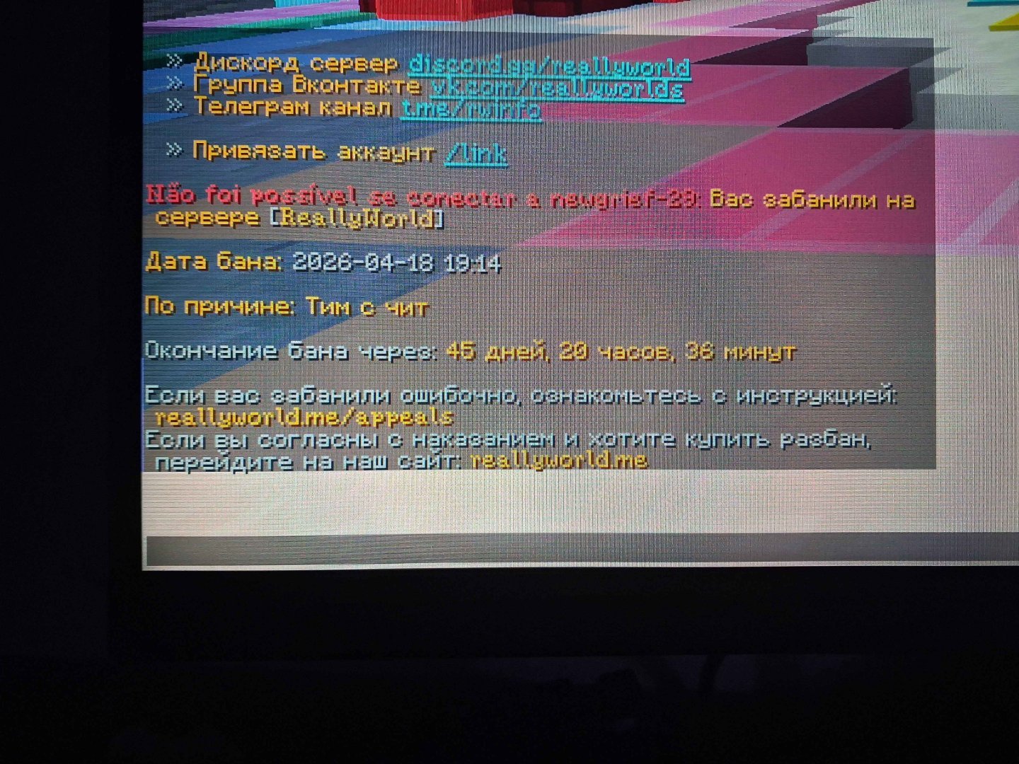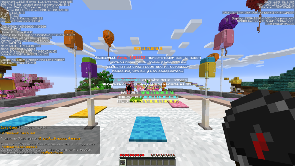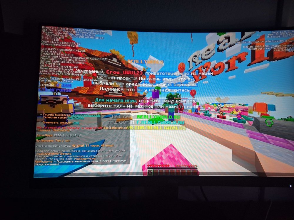 Дополнительный комментарий : Здравствуйте. Обращаюсь по поводу блокировки на ReallyWorld. Я вступил в клан несколько дней назад и не знал, что его участники используют читы или сторонние программы. Сам я ничего не использовал и играл честно.,