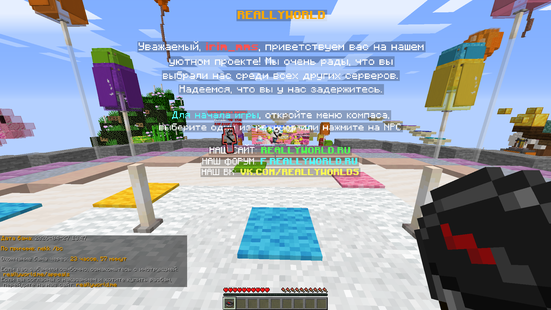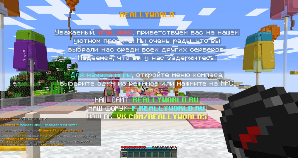 3. Ваш ник: irim_mms Дата нарушения:20.04.2026 Суть нарушения:Выдача бана за читы(не истекло время использования чита) Номер грифа и режим гриферского выживания: Grief 16 Доказательства о нарушении (фото/видео): Дополнительный комментарий:Я признаю что играл раньше с читами(икс рей) но за 2 месяца до того как зайти на Reallyworld удалил их но Администрация нашла остаточный файл того что я удалил (напомню чит(икс рей) был удалён 2 месяца назад) В связи с правилом (5.2.5 Читы удалены менее 14 дней назад [бан на 50 дней]) я нечего не нарушил Важно:
