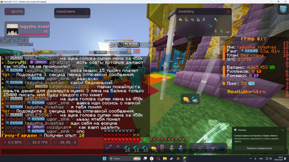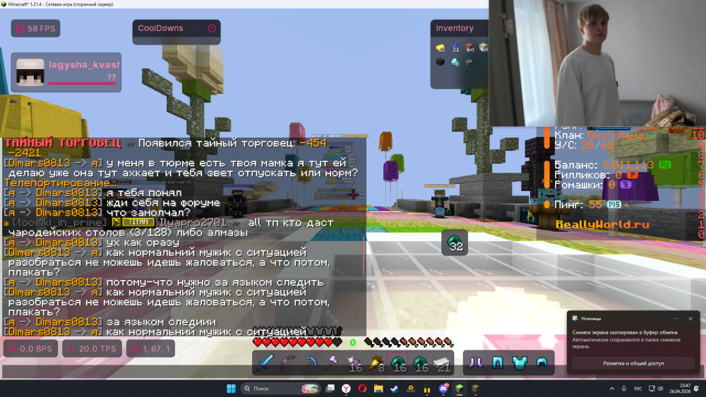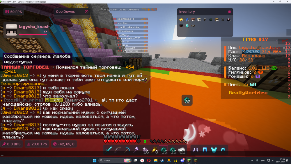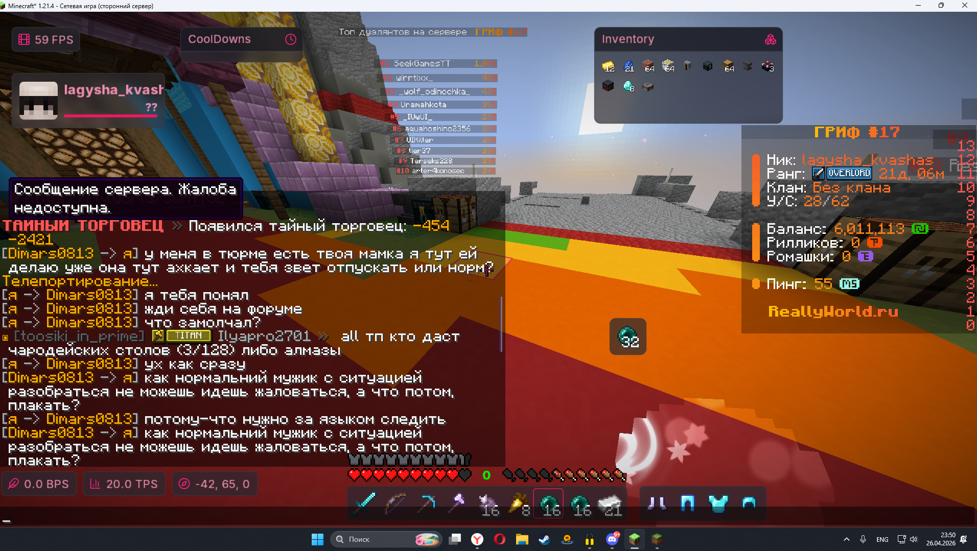 1. Ваш ник: lagysha_kvasha Ник нарушителя: Dimars0813 Дата нарушения:22:53 Суть нарушения:чел просто начинает писать мне про мою мать На каком гриферском режиме было нарушение (MEGA-GRIEF/GRIEF-1.16) : Арх., 17 гриф Доказательства о нарушении (фото/видео)