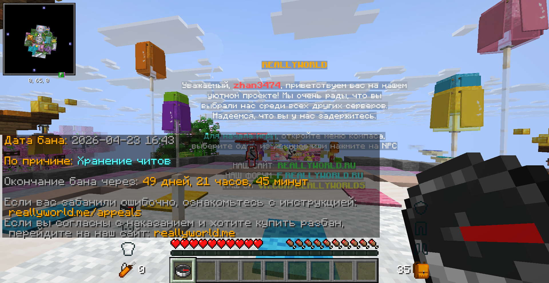 Участник 1 Опубликовано 13 минут назад ник: zhan3474 день бана : 23.04.26 меня забанили по причине хранение читов но дело в том что я использовал их в одиночке и находились они у меня в совсем другом модпаке Хотел бы сокрощение бана или разбан всё уже удалил и приношу извенения если это запрещено Так-же хотел бы сказать что модератор скачал мне какой-то файд ПРОШУ СОКРОТИТЬ СРОК ИЛИ РАЗБАН ПОЖАЛУЙСТА гриф 58