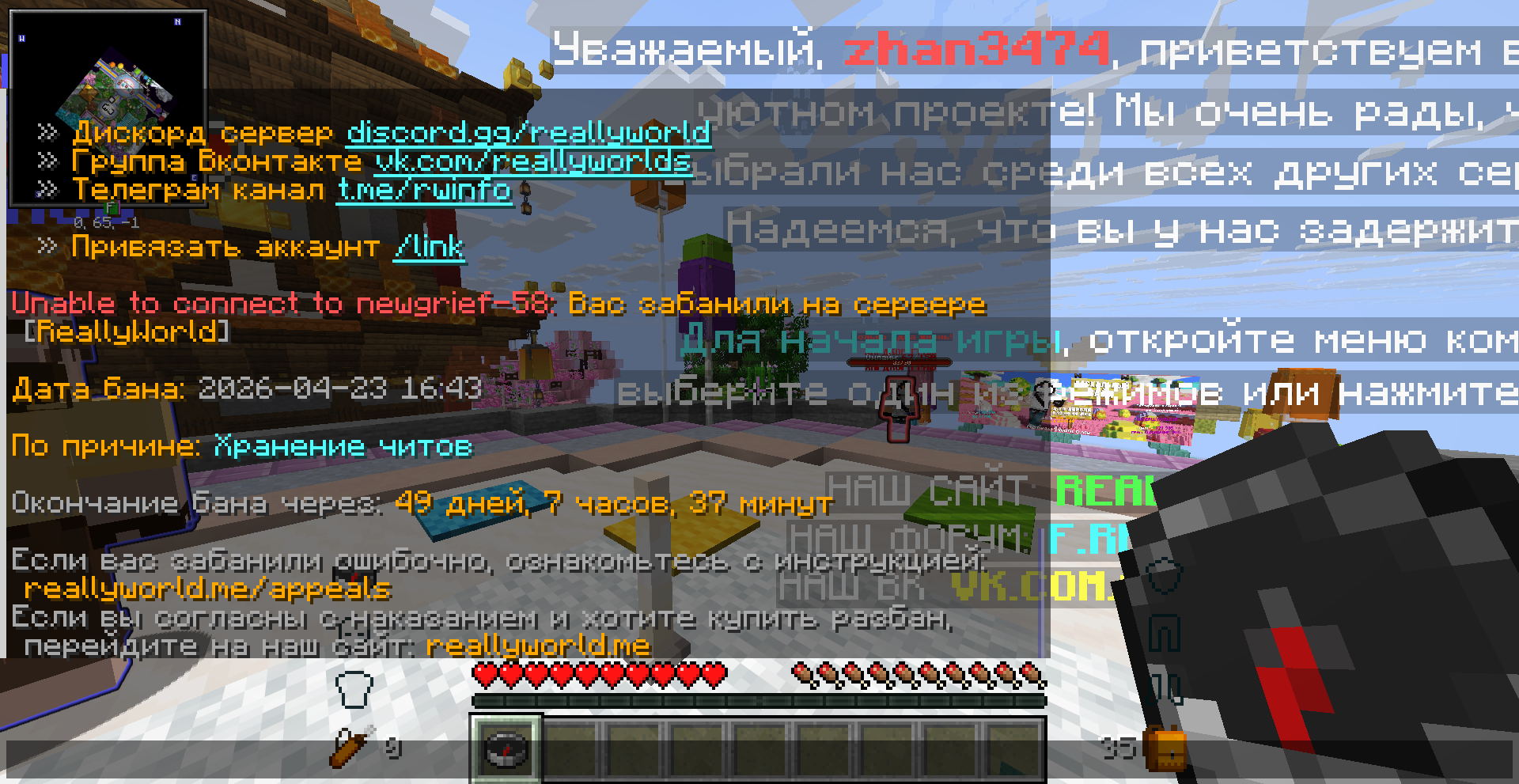 ник zhan3474 меня забанили за то что я играл в одиночке с читами причем проверка показала что модпак с читами не был когда либо запущен на риллике что за сервак где банят за что что играл с читами в одиночке тем болле чит был удален 27.03.26 а бан 23.04.26 прошу проверить ведь модер нашел уже удаленый чит из пака и из тлаунчера но он остался в корзине перепроверте Что за сервак где банят за удаленные читы которые не были использавны на серваке Не самый лучший модер не нашев нечего в .Minecraft полез в корзину проверте еще раз а