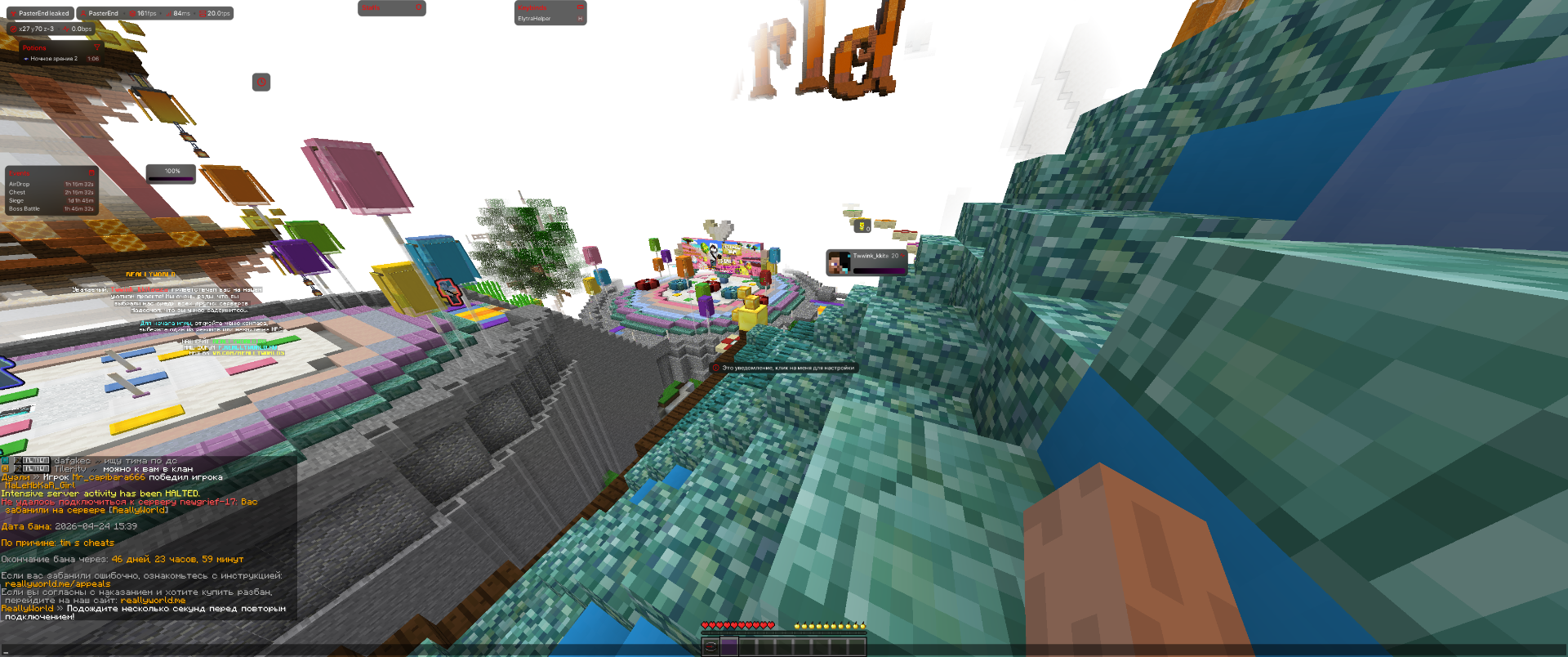 1. Ваш ник:twwink_kkitaeza Дата нарушения:2026-04-24 15;39 Суть нарушения:тим с чит Номер грифа и режим гриферского выживания:43 Доказательства о нарушении (фото/видео): Дополнительный комментарий:меня забанили за тим чит хотя я думал что мой тимейт без читов