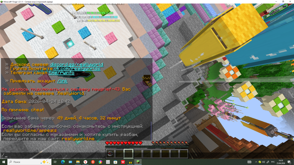 3. 1. Ваш ник: maximus11 2. Дата блокировки, которая указана в наказании: 2026-04-24 18:42 3. На каком гриферском режиме было нарушение: гриф выживание 43 гриф 4. Доказательства о нарушении (скрин блокировки) 5. Дополнительный комментарий (обязательно описывайте последние действия перед баном):Я телепортировал игроков к нам на остров что бы повеселиться, а потом мне выдают бан на 50 дней по причине cheat