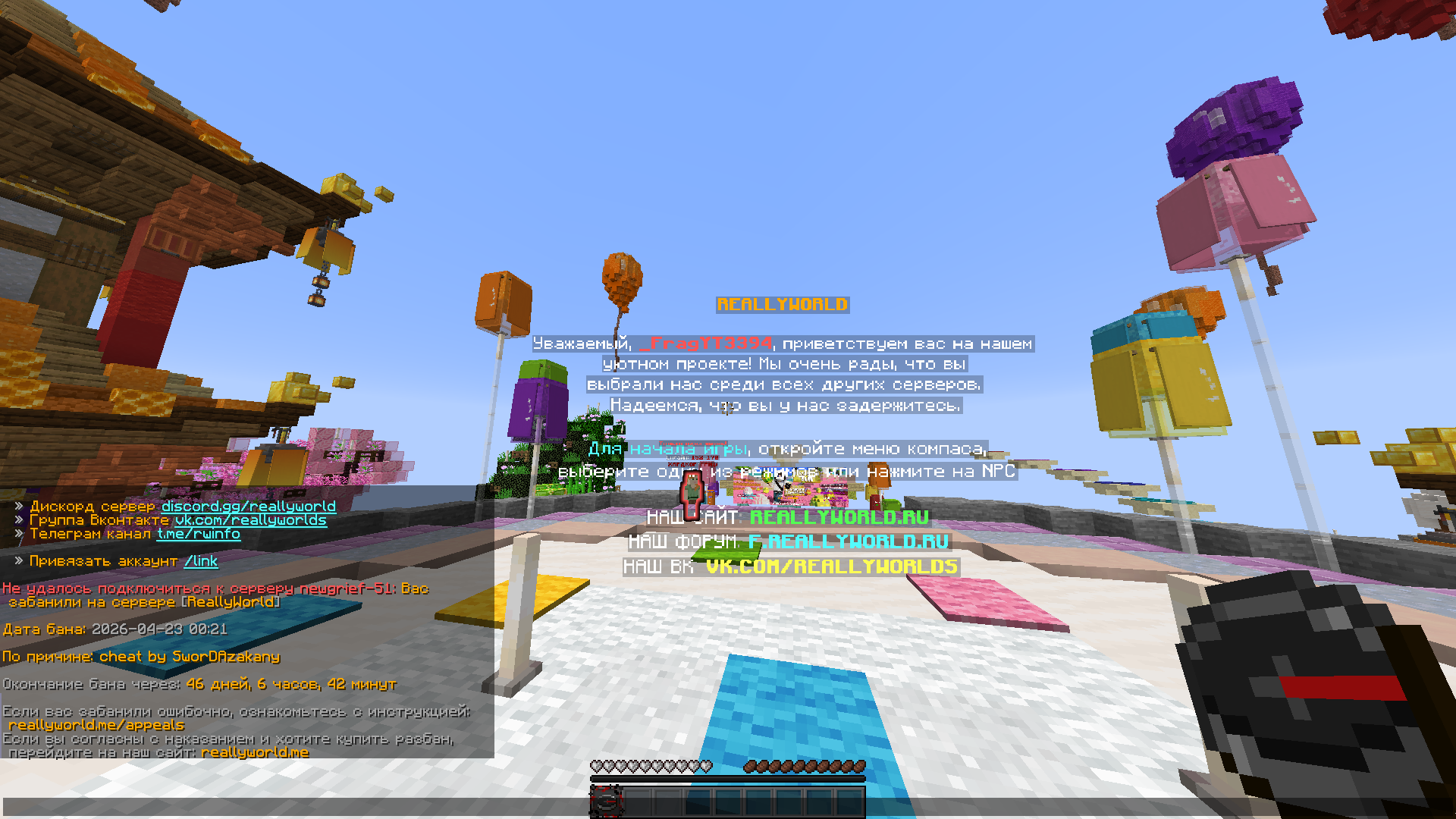 1)ваш ник:_FragYT3394 2)дата бана:2026 04 23 00:21 3)суть нарушения:читы 4)номер гриферского выживания:51 5)доказательства о нарушении фото/видео 6)доп коментарий:я пехался с типами пехаюсь ухожу в сейф зону и меня банят по причине читы без проверки