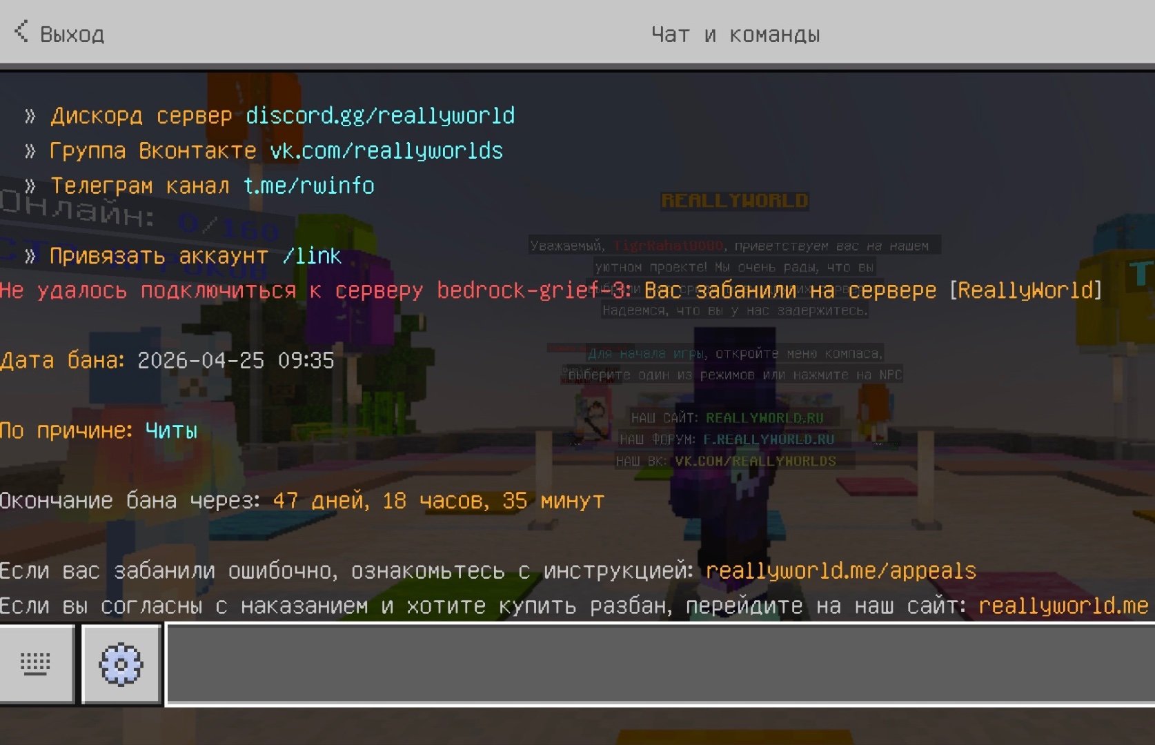 7. Здравствуйте. Хочу обратиться по поводу моего бана. Мой ник — TigrRahat8080, привилегия — IMPERATOR. Я был заблокирован за использование читов, однако заявляю, что никаких сторонних программ или запрещённых модификаций я не использовал. Играю честно и всегда соблюдаю правила сервера, поэтому данный бан считаю ошибочным. Возможно, произошла путаница или неверное определение нарушений. Прошу пересмотреть мой бан и проверить ситуацию более внимательно. При необходимости готов предоставить любые доказательства своей честной игры. Надеюсь на справедливое решение. Спасибо.